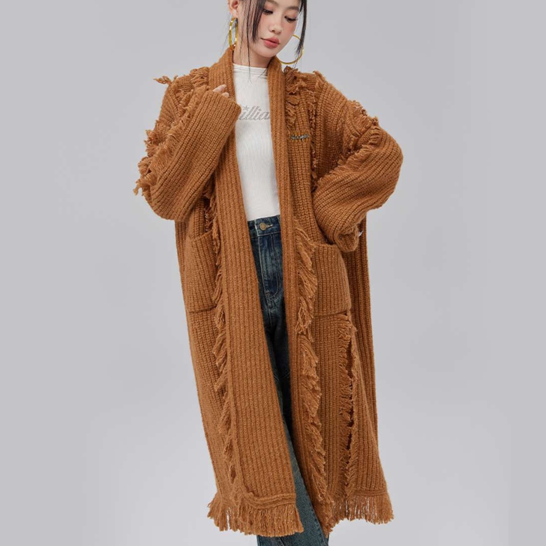 オフィスで個性を演出する可愛いフリンジニットカーディガン