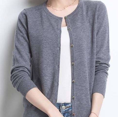 ベーシックなカラーで、オフィスでの様々なコーディネートに対応できる汎用性の高いカーディガンです。