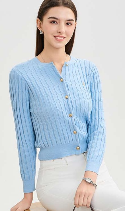 鮮やかなスカイブルーが春夏コーデを明るく彩る、ケーブル編みのレディースショート丈カーディガンです。