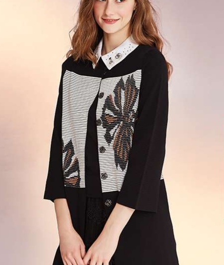 エレガントな花柄の切替えデザインが印象的な黒カーディガンは、黒パンツとの組み合わせで洗練されたレディーススタイルを演出します。