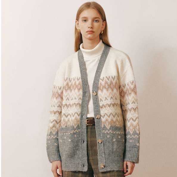 北欧調フェアアイル柄ボタン付きロングカーディガン