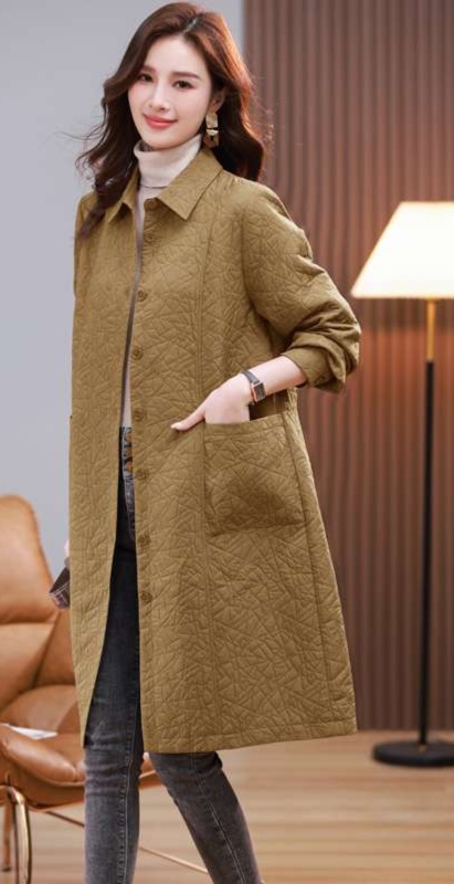 ベージュの優しい色合いが女性らしさを引き立て、ロング丈のシルエットが体型カバーにも効果的です。