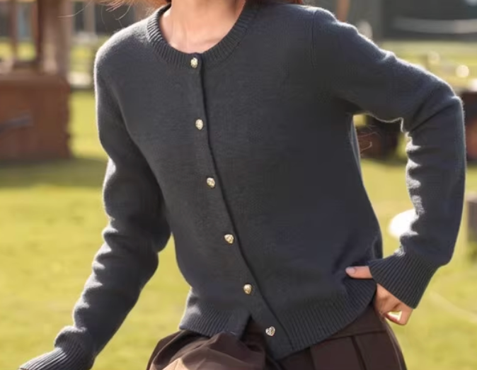 シンプルで使いやすいグレーのショート丈カーディガンは、ワードローブの定番アイテムとして活躍してくれます。