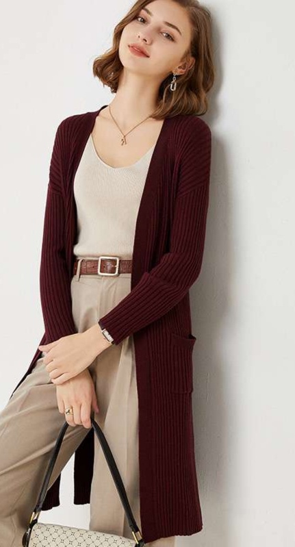 茶色のリブ編みウエストマークレディースロングカーディガン