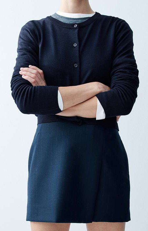黒いカーディガンでありながら、ボタンのデザインによってフォーマルな場面でも活躍します。