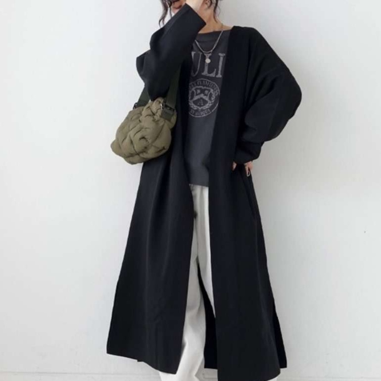ロング丈のシルエットが縦ラインを強調し、黒いカーディガンならではのモードな雰囲気を楽しめます。