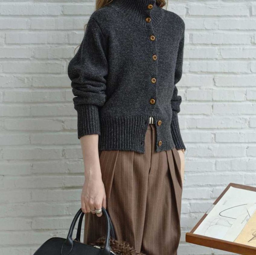 襟付きのデザインとケーブル編みの組み合わせが温かみと上品さを両立させ、冬のコーディネートを格上げしてくれます。