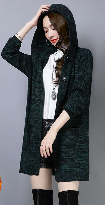 シンプル志向のざっくり編みフード付きレディースカーディガン