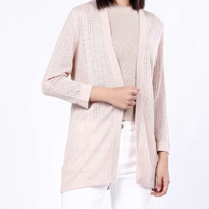 上品なリブ編みデザインが特徴的な夏向けロングカーディガンです。