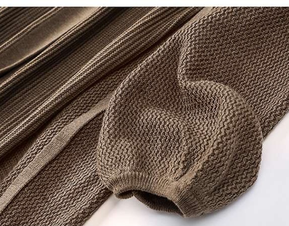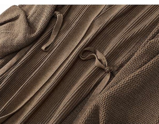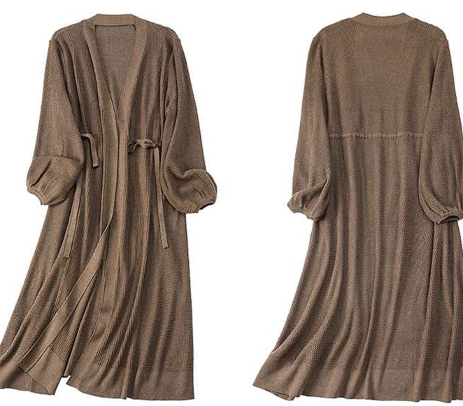 ウエストを美しく引き締めるサイドリボン付きのブラウンレディースカーディガン。ロング丈が上品さを演出し、ふんわりとした袖デザインで女性らしさを引き立てる。リブ編みの質感と薄手素材により、軽やかな着心地を楽しめ、さまざまなスタイルにマッチする万能アイテム。季節を問わず活躍する一着として、ワードローブに加えたい。