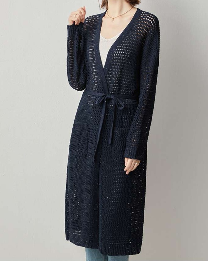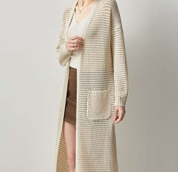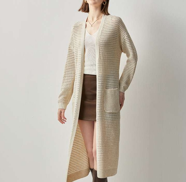 優雅な透かし編みデザインの黒いレディースカーディガン。ロング丈で、薄手素材が軽やかな着心地を提供し、涼しげな印象を演出します。前開きタイプのため、羽織りやすく、便利なポケットも完備。スタイリッシュなシルエットが特徴で、春夏のコーディネートにぴったり。上品な装いで、どんなスタイルにもマッチするアイテムです。