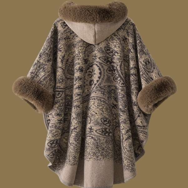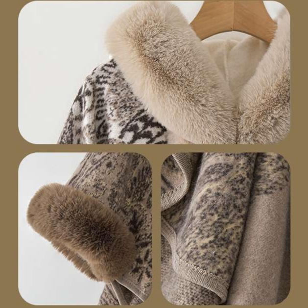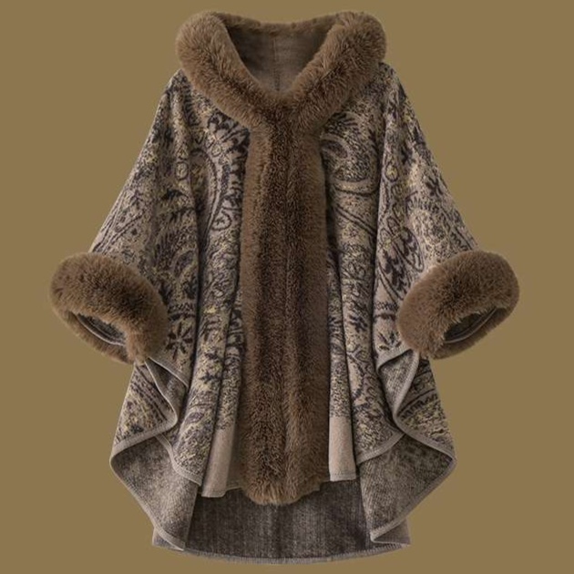 上質なブラウンファーで縁取られたロング丈のレディースカーディガン。優雅な総柄デザインと豊かなファーが絶妙に調和し、エレガントな印象を与えます。ケープ風のゆったりとしたシルエットは体型を美しくカバーし、肌寒い日にもぴったり。羽織るだけで上品な装いを実現する、この一着はコーディネートに華を添える特別な存在です。