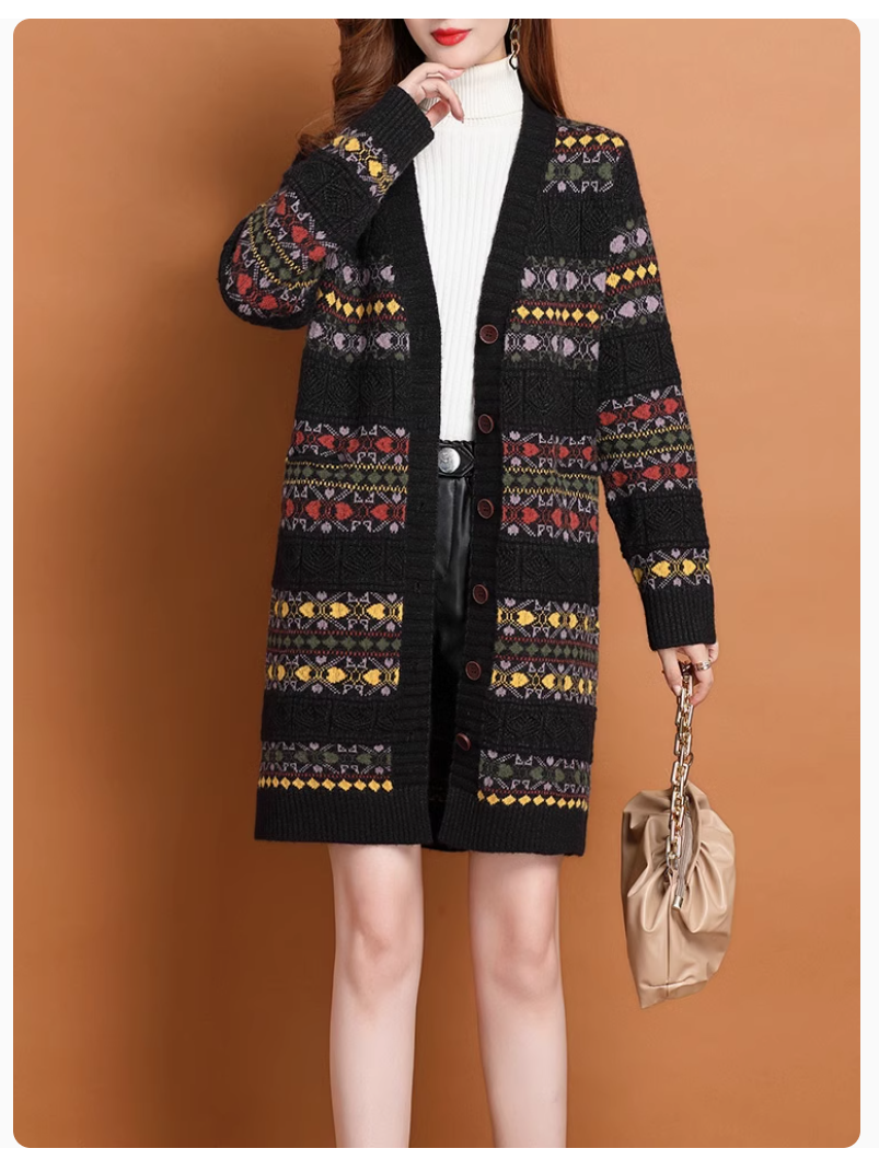 伝統的な幾何学模様が際立つブラウンのレディースカーディガン。ロング丈シルエットは秋冬のフォークロアスタイルにぴったり。繊細な編み込みがシックな雰囲気を醸し出し、フロントボタンで自由に着こなしが楽しめる。すっきりとしたデザインはデイリーユースから特別な日まで、幅広く活躍するアイテムです。温かみのあるブラウンが、どんなコーディネートにもマッチします。