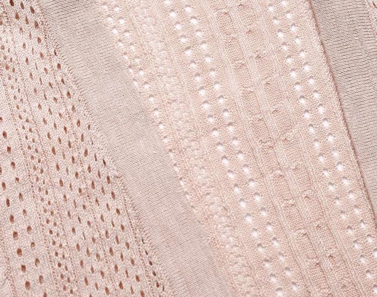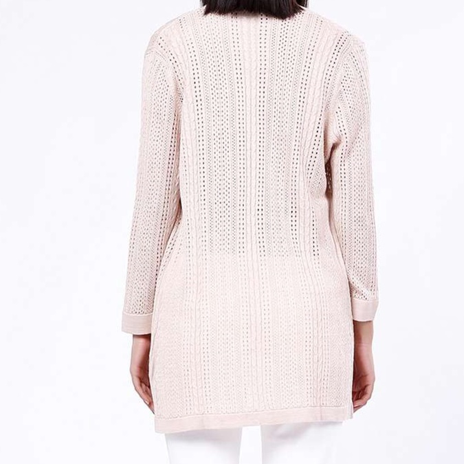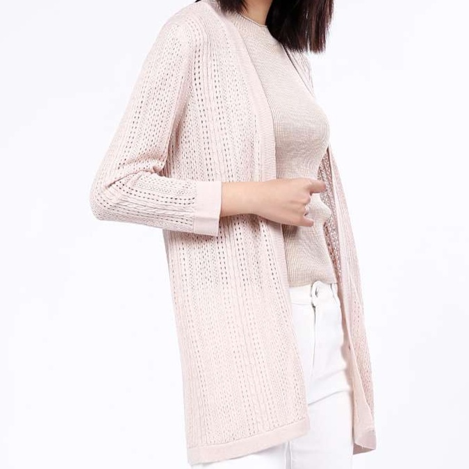 透かし編み模様が繊細に施されたピンクのレディースカーディガン。ミドル丈が体のラインを美しく引き立て、薄手の素材感が季節の変わり目にぴったりです。前開きデザインで着脱が簡単なため、忙しい日常でも便利。オフィスカジュアルにもマッチし、上品さを演出する一枚として活躍します。優しいピンクの色合いが、コーディネートに華やかさをプラスしてくれるアイテムです。