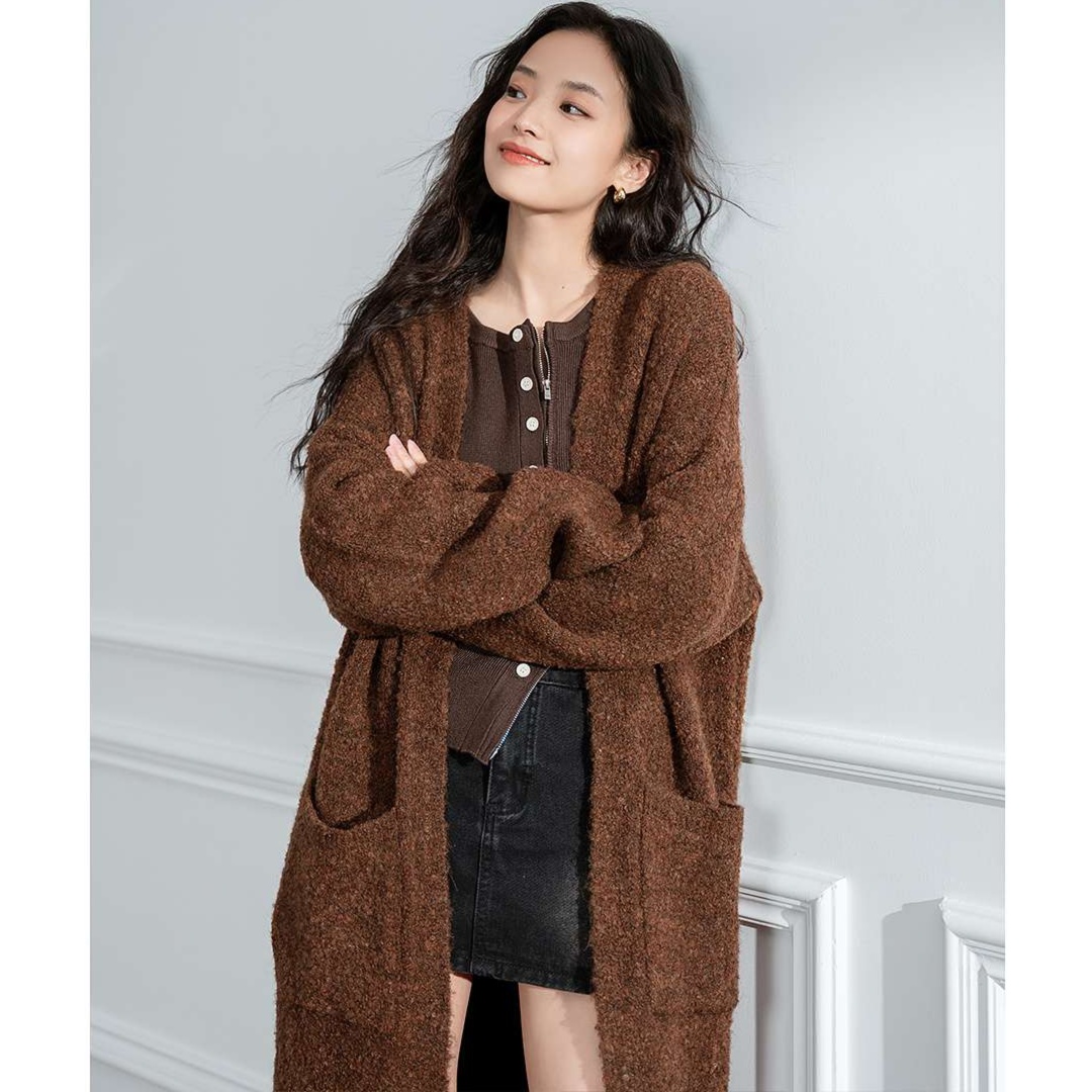 柔らかな素材感が心地よいブラウンのレディースカーディガン。ロング丈が体型を優しくカバーしつつ、大人の可愛らしさを引き立てるデザイン。ボタンデザインのインナーとの重ね着コーディネートが特におすすめ。シンプルながらも存在感のある一着で、デイリーユースにぴったりな万能アウターとして活躍します。トレンドを押さえつつ、リラックスしたスタイルを楽しめるアイテムです。