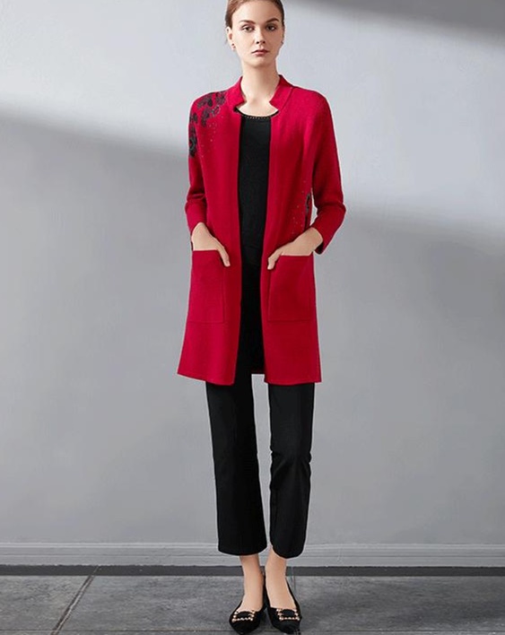 華やかな赤色が目を引くレディースカーディガン。肩元には上品な花の刺繍と輝くラインストーンが施され、特別な日にもぴったりです。ロング丈のすっきりしたシルエットは体型を美しくカバーし、スタイルアップを実現します。実用的な大きめポケット付きで、日常使いやお出かけシーンでも大活躍。着るだけで気分も明るくなる、必見の一着です。