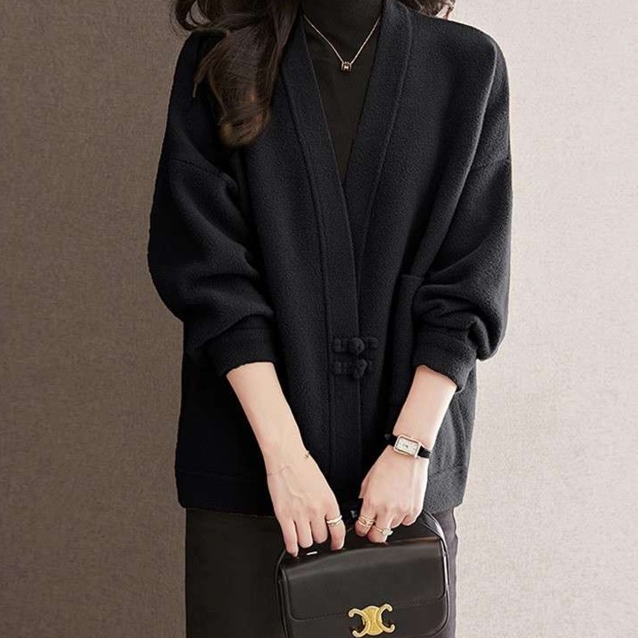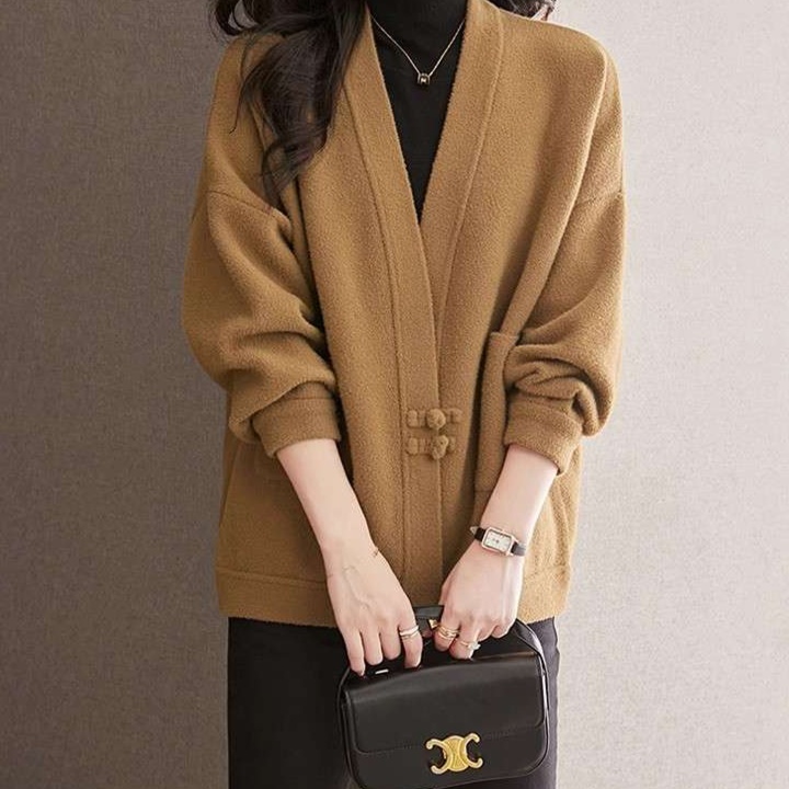 シンプルな留め具とドロップショルダーが今どきの抜け感を演出