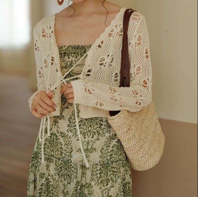 透かし模様が美しい繊細なレースデザインのレディースカーディガン。ベージュカラーが優しい印象を与え、前紐で結ぶデザインが女性らしさを引き立てます。