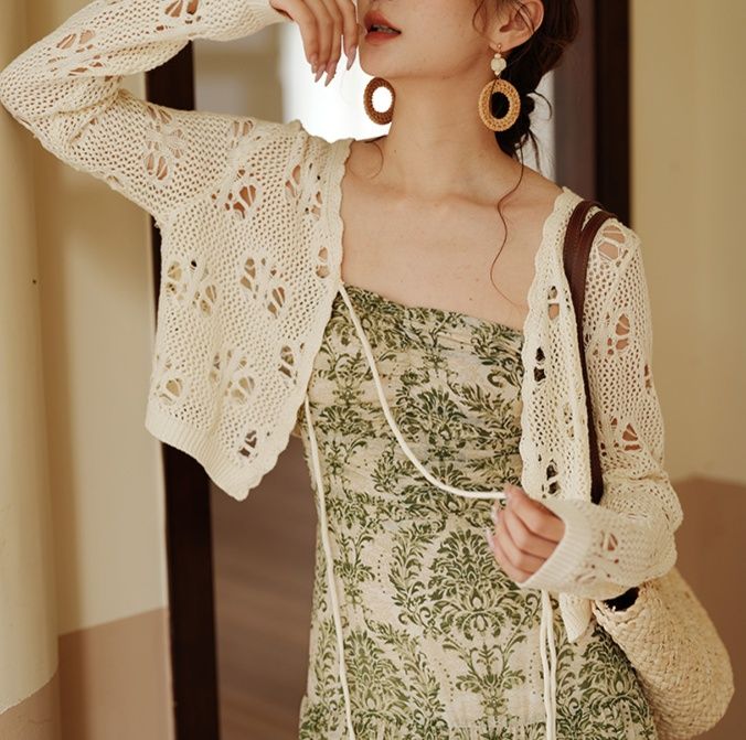 袖には花のようなレース模様が広がり、ショート丈で春夏のワンピースやキャミソールに合わせやすい一枚です。