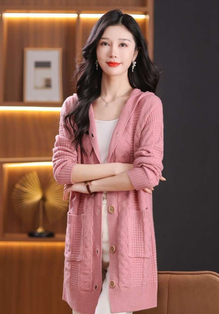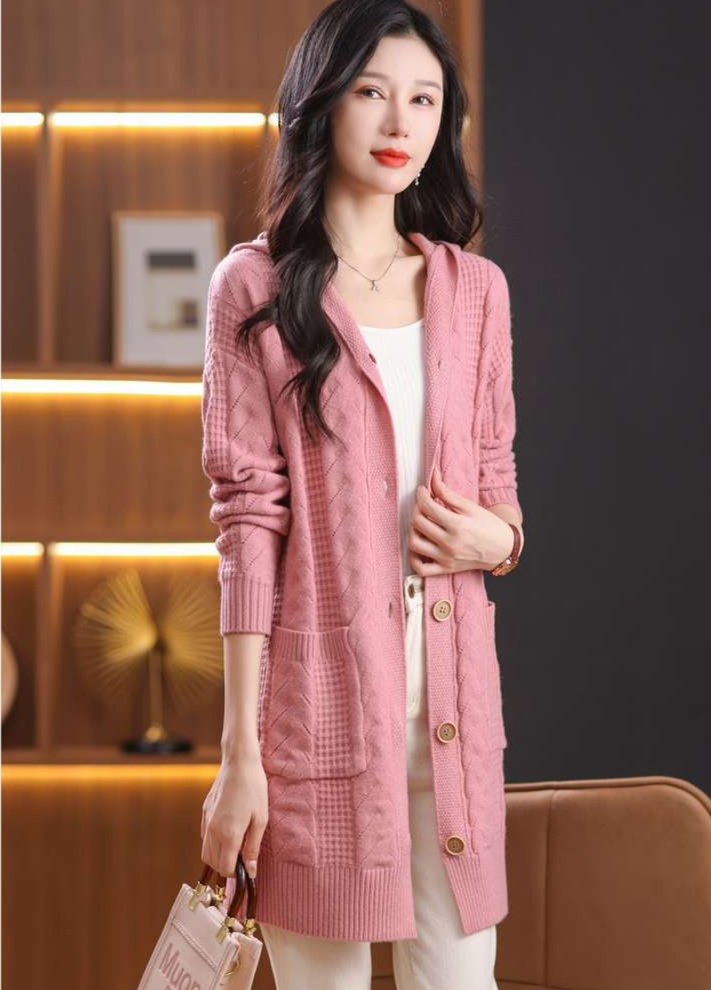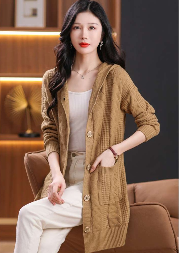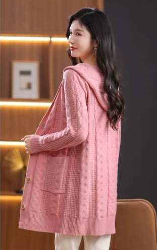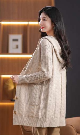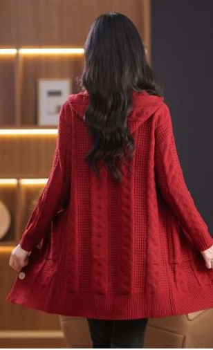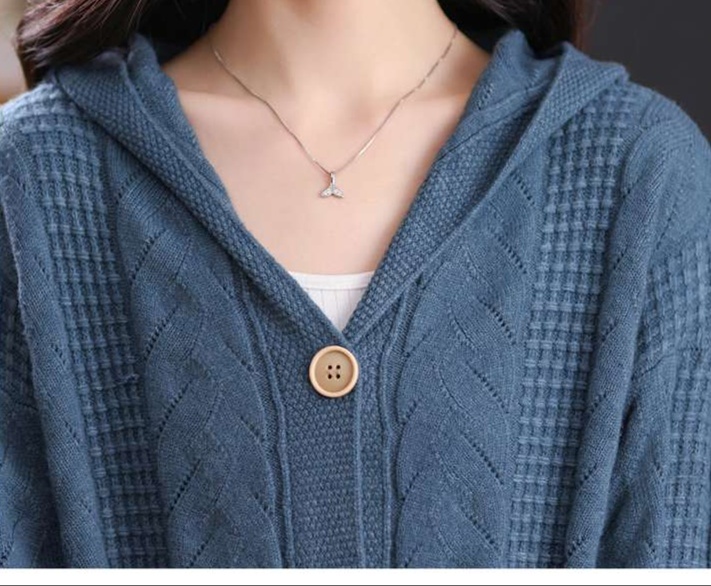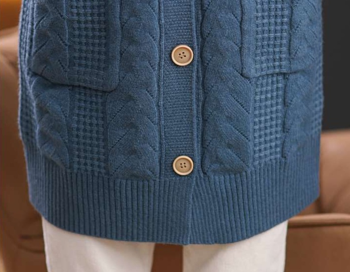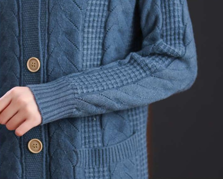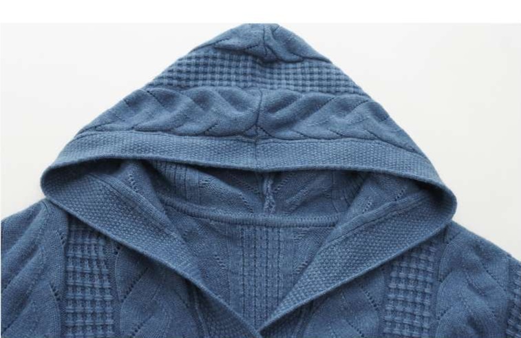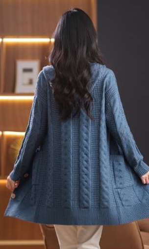 上品なケーブル編みと格子模様が特徴のレディースカーディガン、ミドル丈の青色が魅力的な一枚。カジュアルなフード付きデザインは、リラックスしたスタイルにぴったり。大きめのボタンがアクセントとなり、シンプルながら華やかさを演出。柔らかな素材感で、着心地も抜群。両サイドのポケットも実用的で、日常使いに最適なアイテムです。