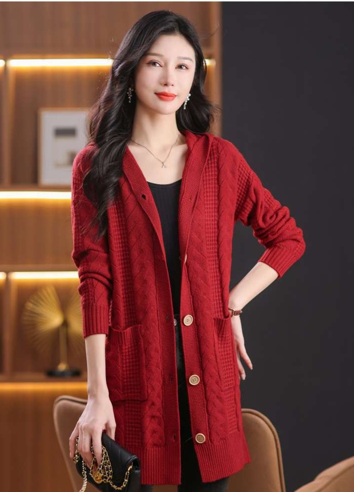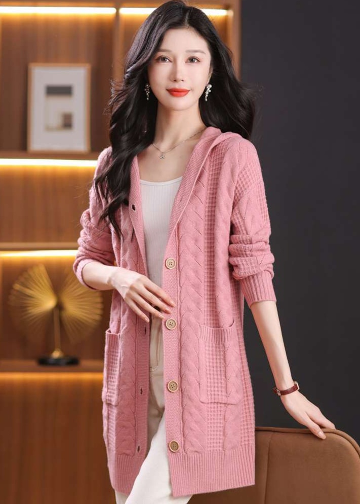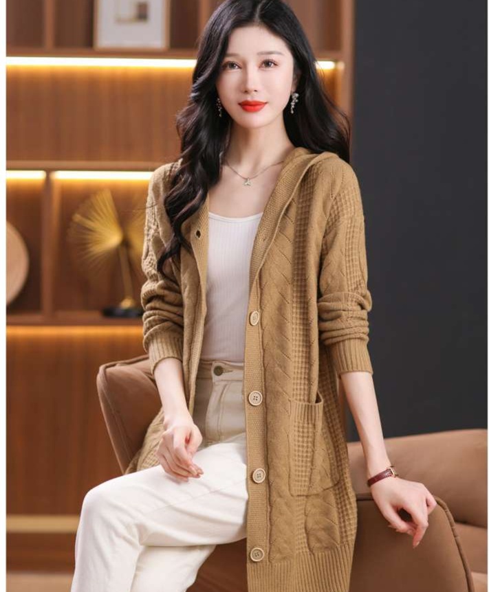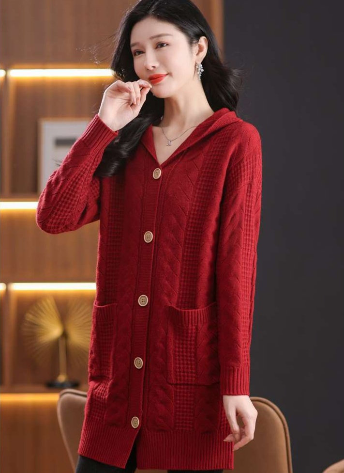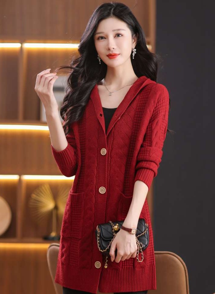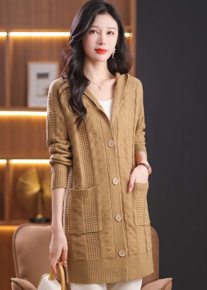 上品なケーブル編みと格子模様が特徴のレディースカーディガン、ミドル丈の青色が魅力的な一枚。カジュアルなフード付きデザインは、リラックスしたスタイルにぴったり。大きめのボタンがアクセントとなり、シンプルながら華やかさを演出。柔らかな素材感で、着心地も抜群。両サイドのポケットも実用的で、日常使いに最適なアイテムです。