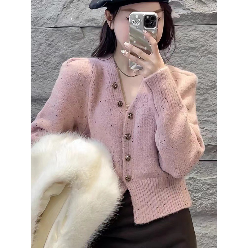 上品な印象を与えるショート丈のレディースカーディガンです。