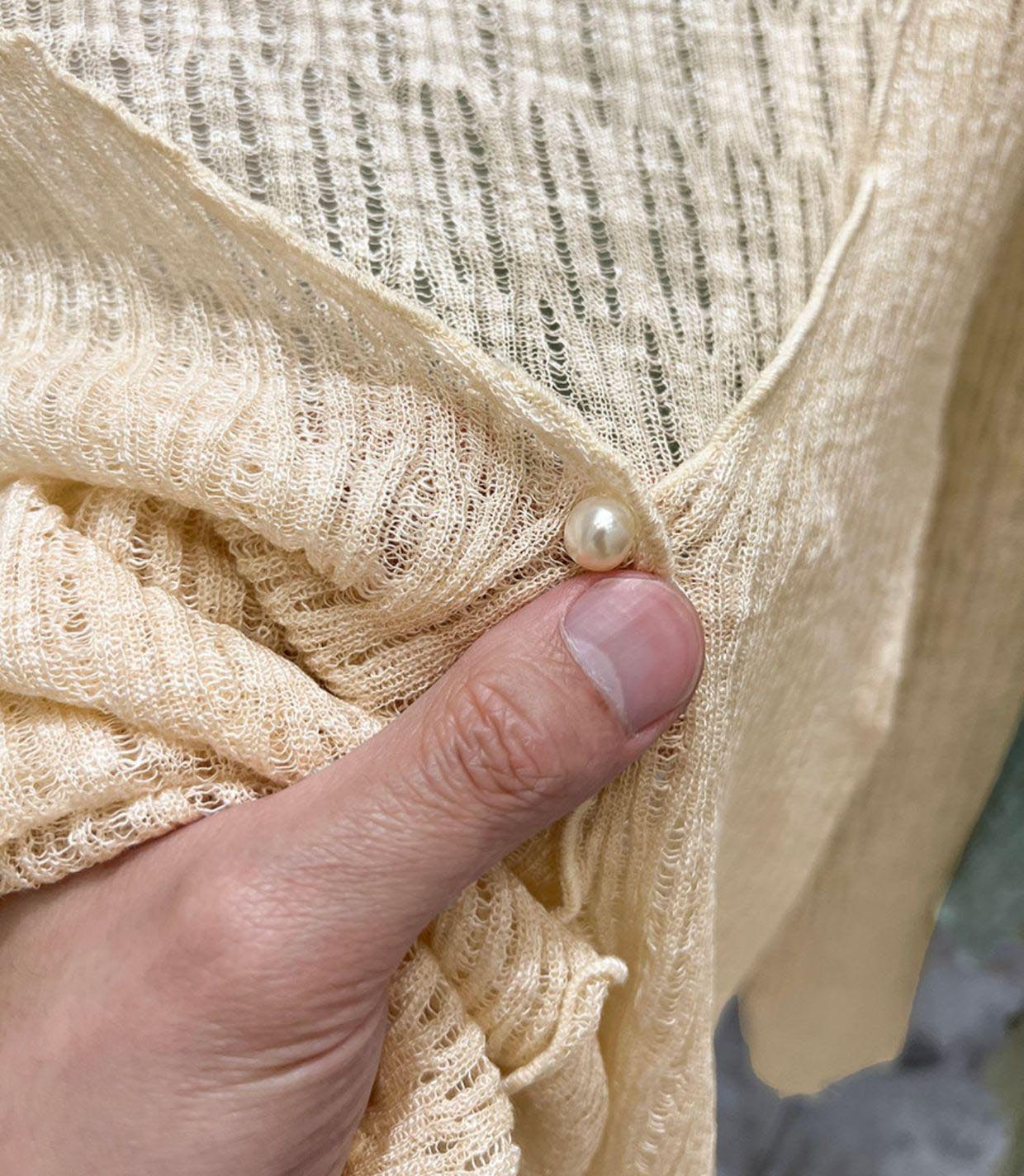 胸元のパールボタンが女性らしさを演出し、上品で洗練された仕上がりに