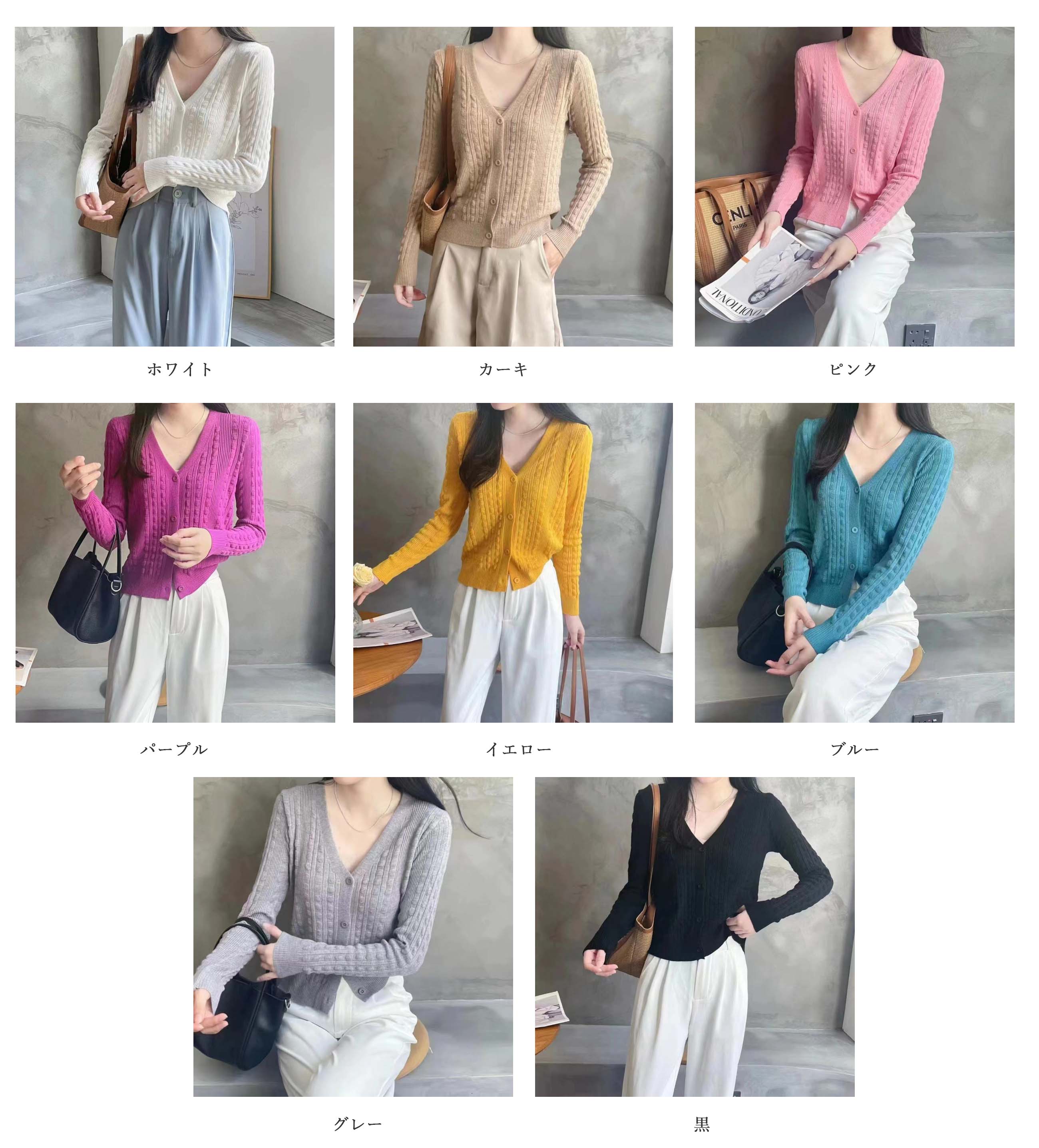 ■コメント ・ベーシックなVネックデザインで使いまわしバツグン ・程よい細身の袖デザインで腕ラインきれい魅せ。 ・程よい抜け感と女性らしさが演出でき、秋口から春先までお出かけに大活躍してくれる1着です。 ・スカートやワンピ、ジーンズにも合わせやすいです。 ・カーディガンとしても、ボタンを閉じて、プルオーバーとして着こなすのもおすすめです。 ■サイズ(単位:cm) FREE着丈50、袖丈55、バスト82 肩幅34(OK) ■カラー 商品画像に記載 ■伸縮性 ややあり ■透け感 色によってあり ■素材 綿85%、ポリエステル15%