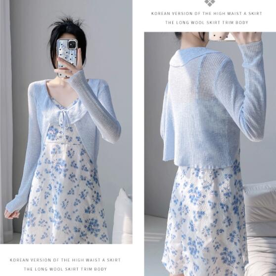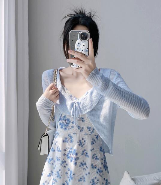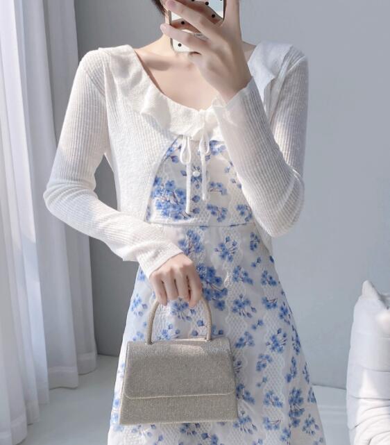 透け感のあるニットと花柄の組み合わせが軽やかで春らしい印象を創出