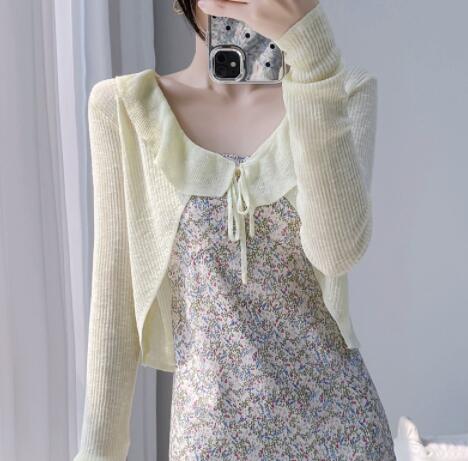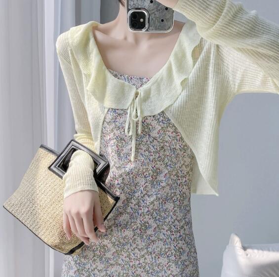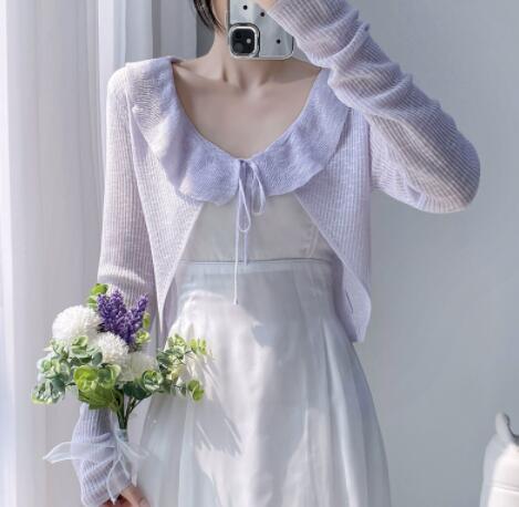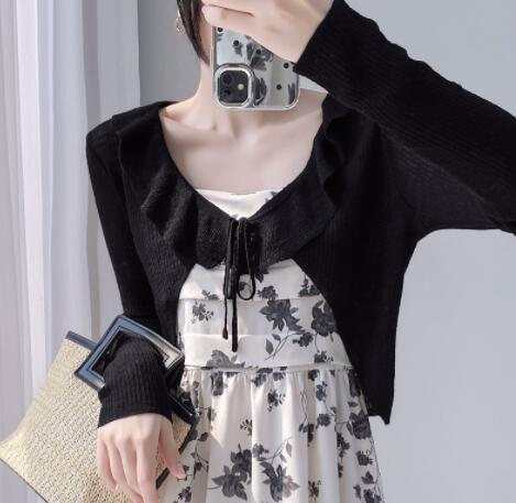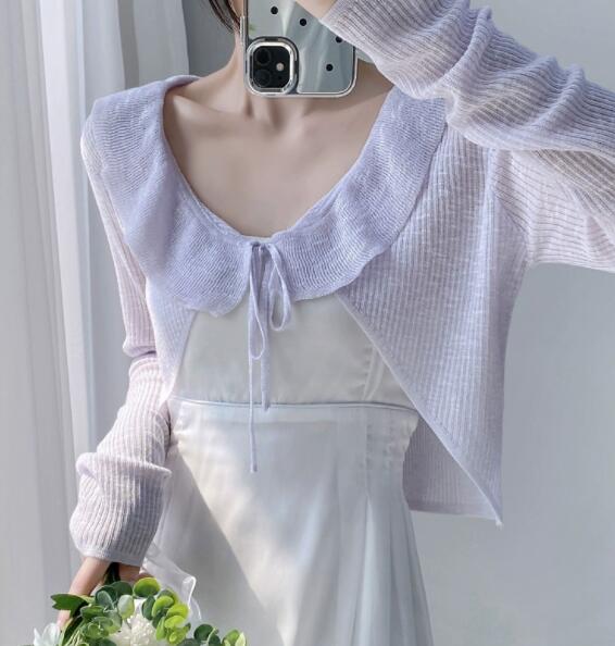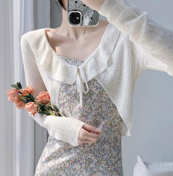 上品なフリル装飾が魅力的なレディースカーディガン。