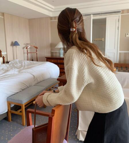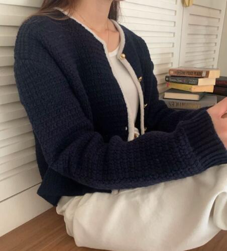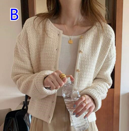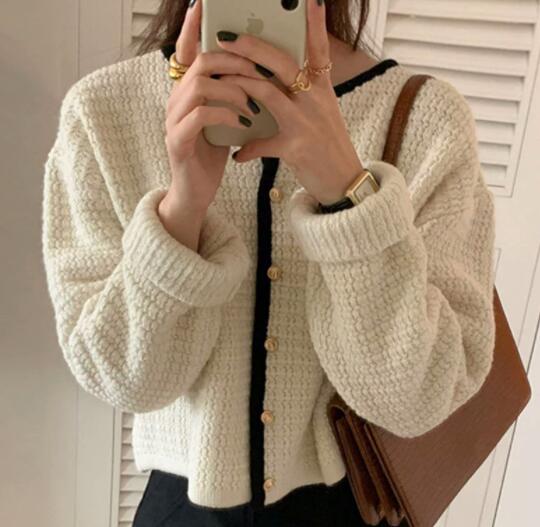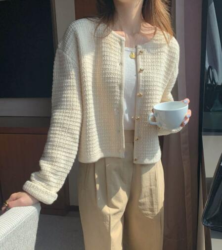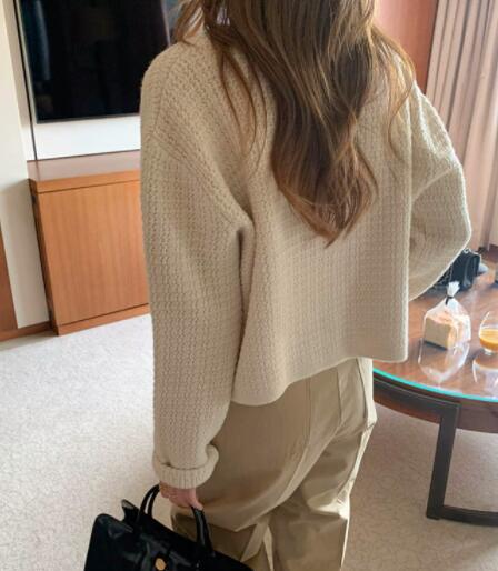 優しい丸首のラインが柔らかく上品な印象を与え、フェミニンな魅力を引き立てる