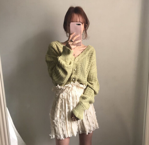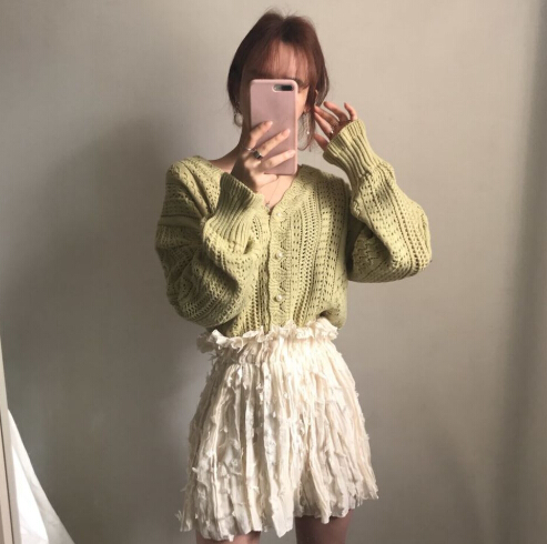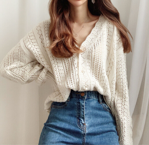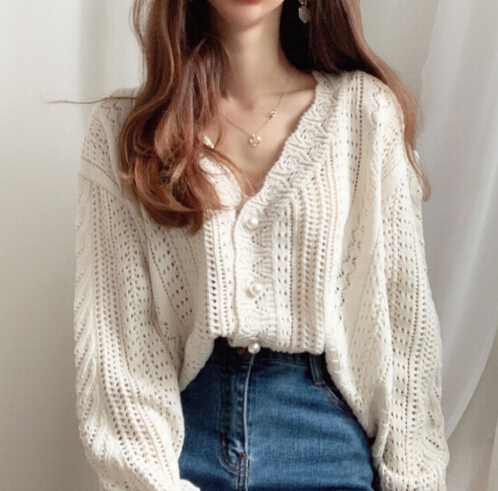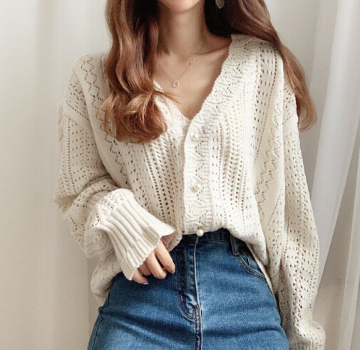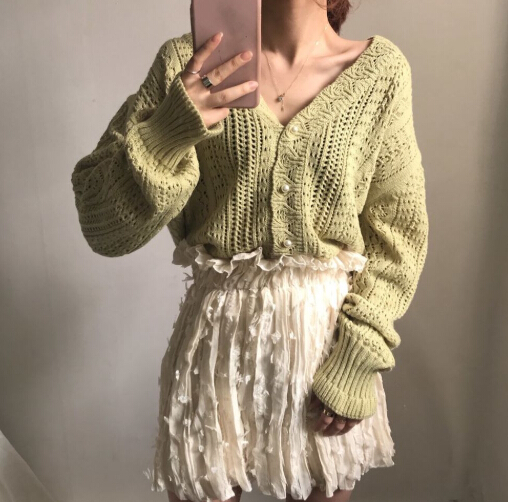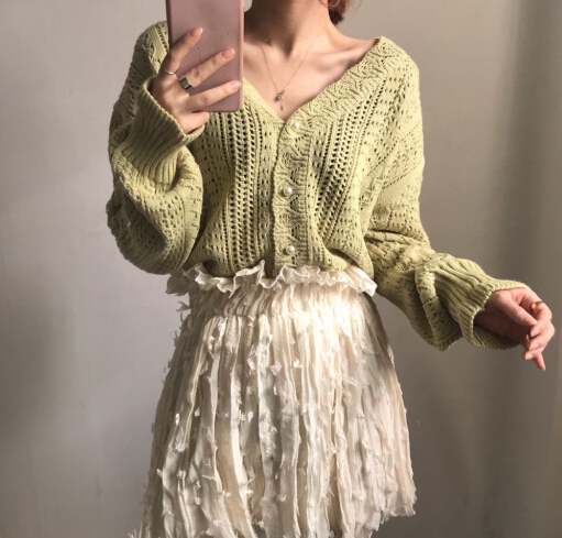 軽やかな透かし編みが魅力的なショート丈レディースカーディガン。