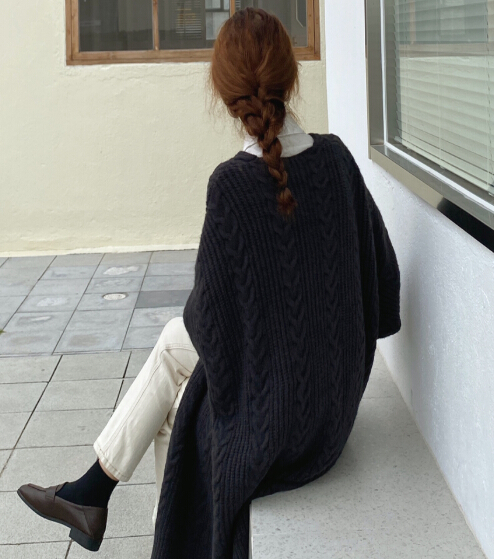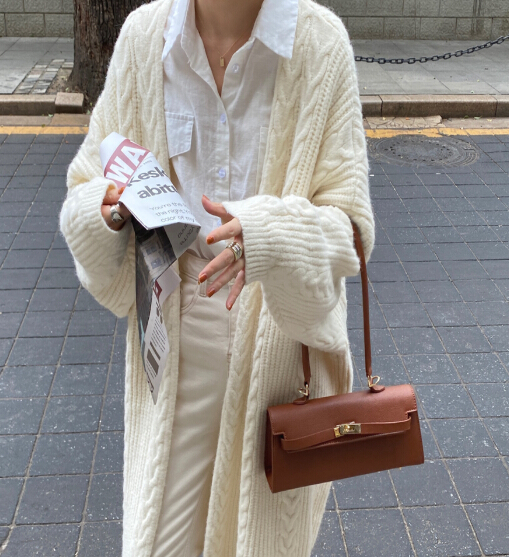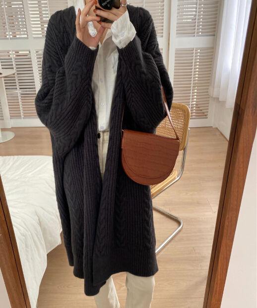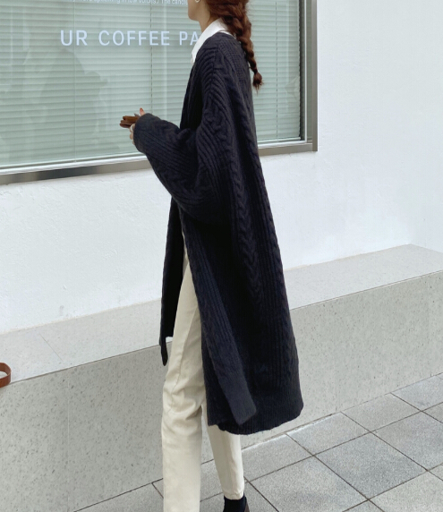 上品な女性らしさを演出するケーブル編みのロング丈カーディガンです。