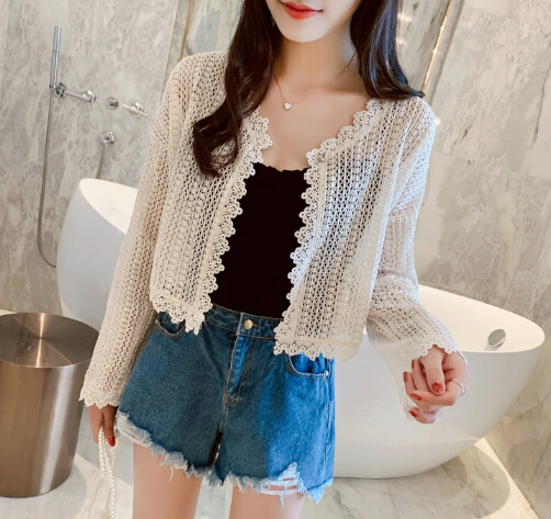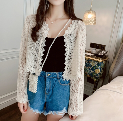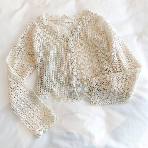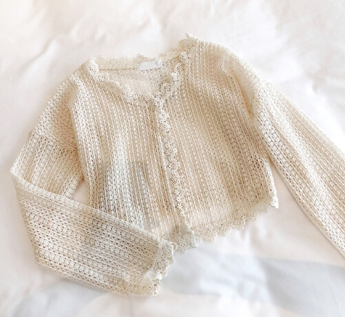 上品なレース編みが美しいショート丈のレディースカーディガンです。