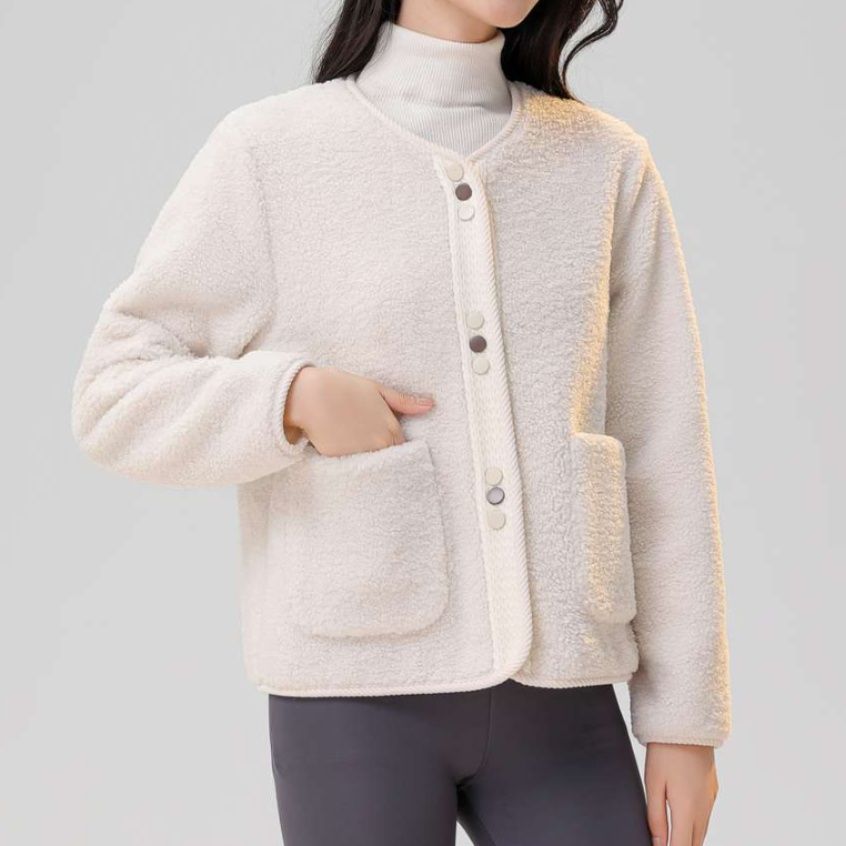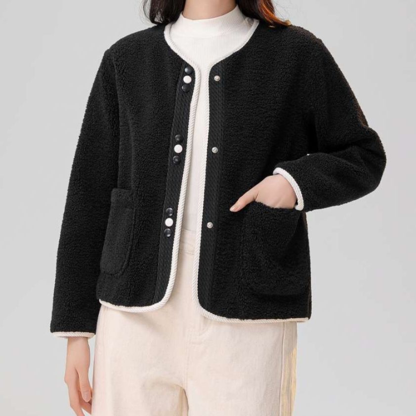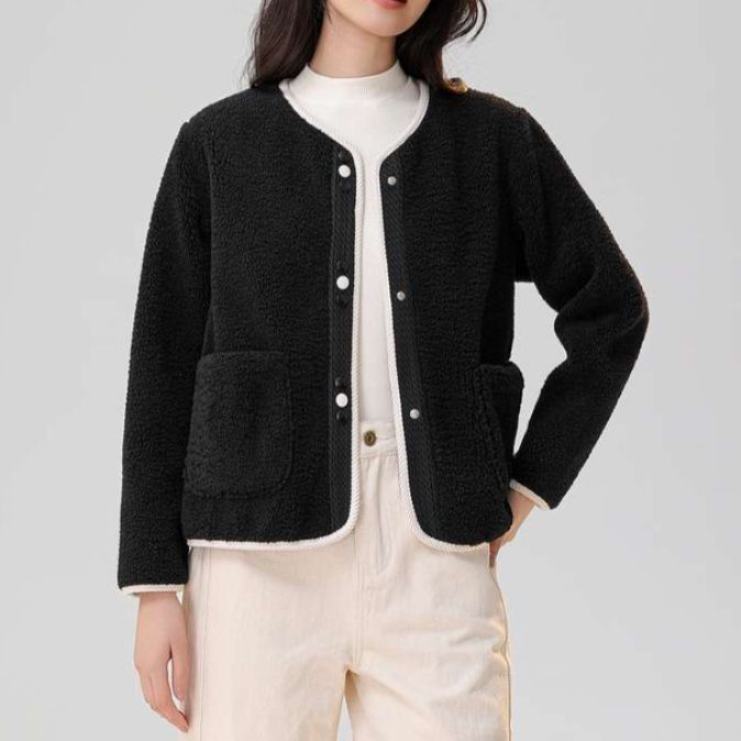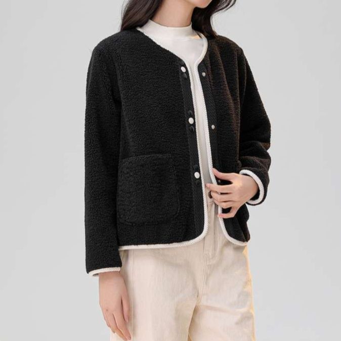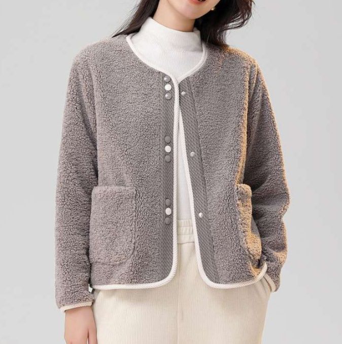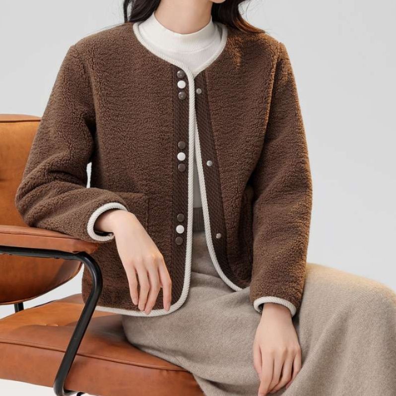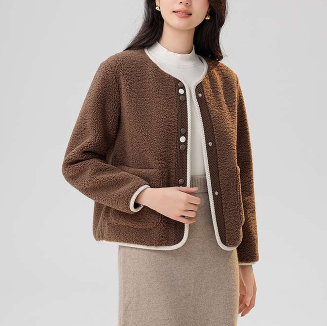ふんわり暖かいボア素材を使用したブラウンのレディースカーディガン。白のパイピングがシンプルな中にも魅力を引き立てる。大きめのポケットと光沢のあるボタンが洗練された印象を与え、カジュアルな普段着からオフィススタイルまで幅広く活躍する一枚。秋冬のコーディネートに欠かせないアイテム。