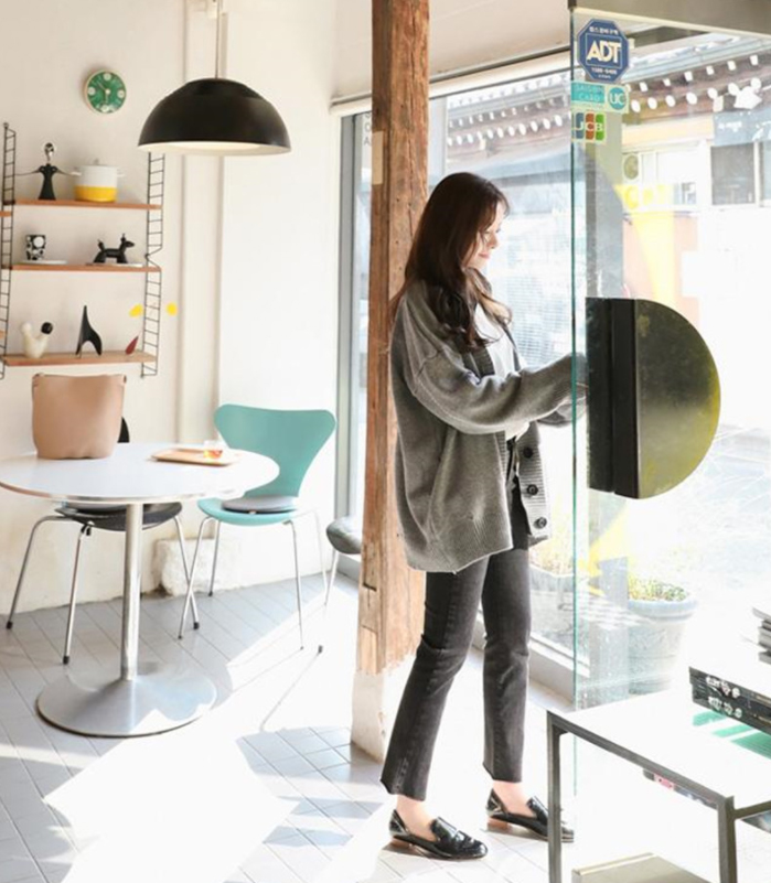 大きめのボタンが縦のラインを強調し、きちんと感のある知的な雰囲気をプラス