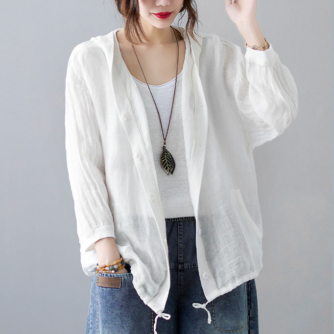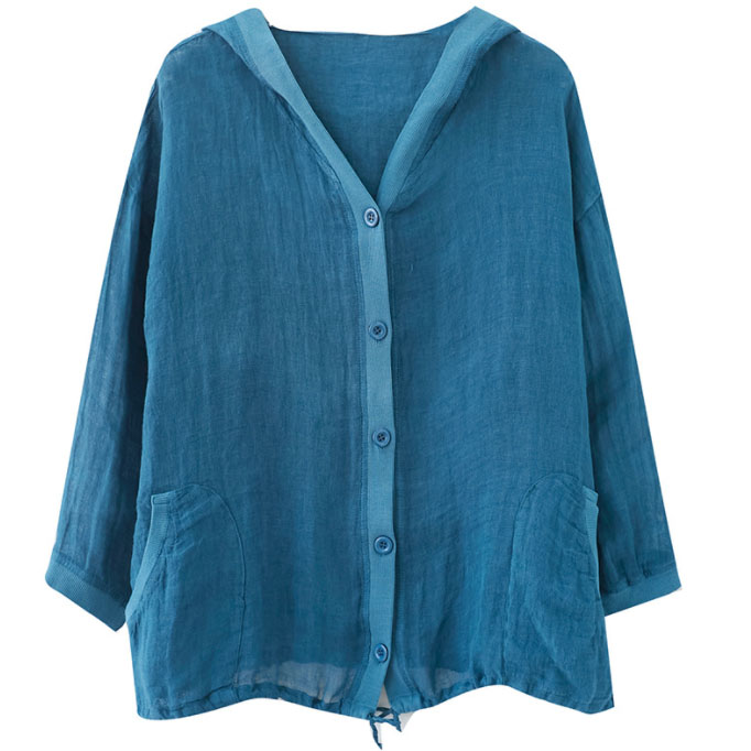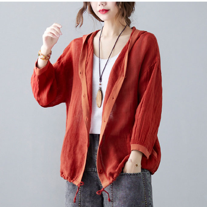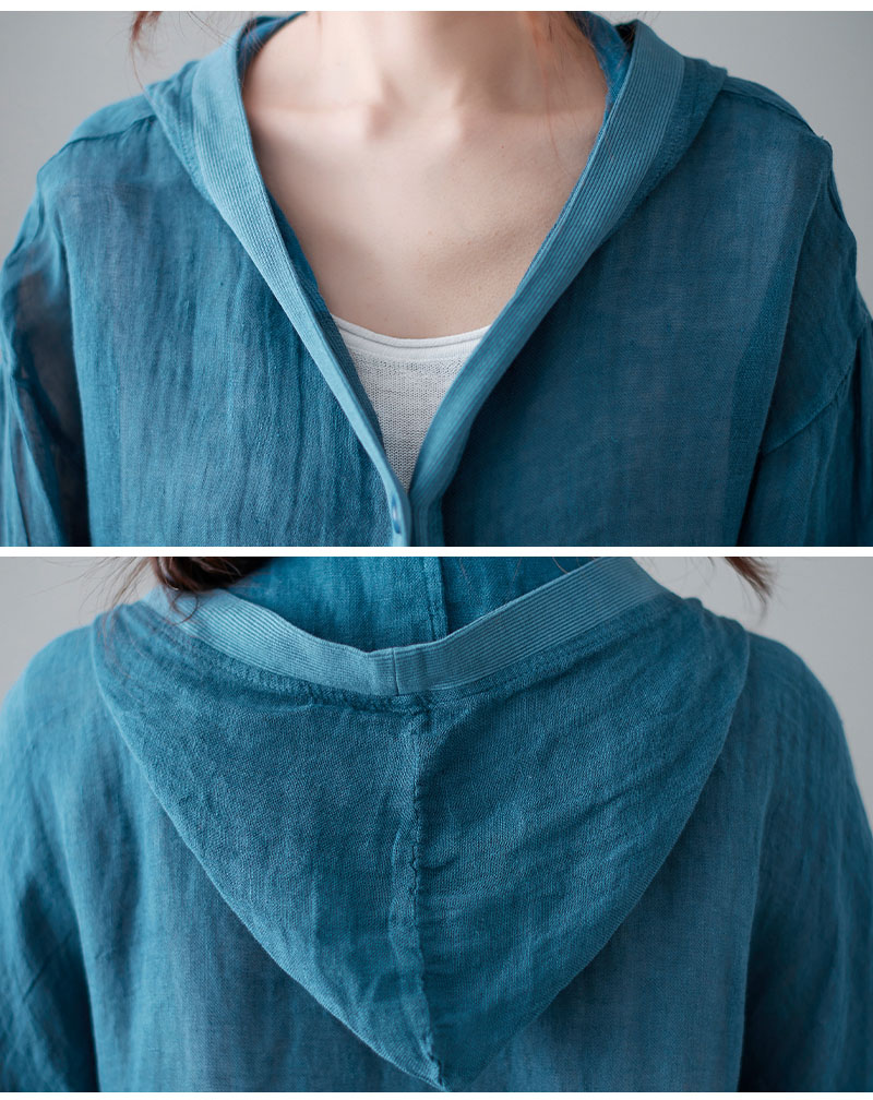 軽やかな綿麻素材を使用したミドル丈で、フード付きデザインが特徴的。