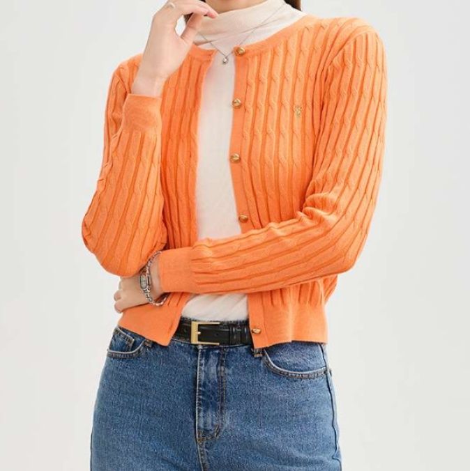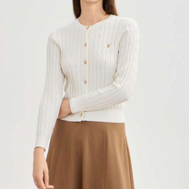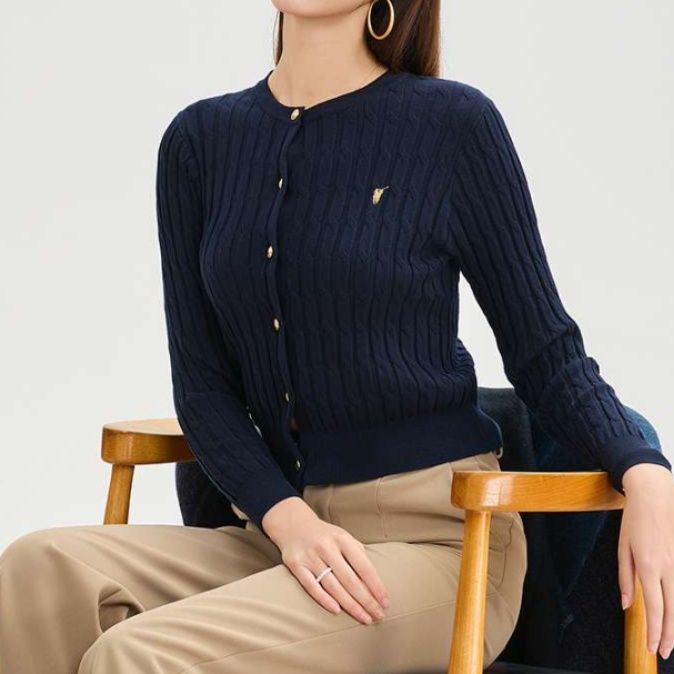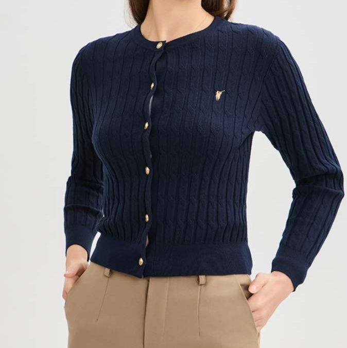 高品質な縫製が際立つレディースカーディガン。鮮やかな青色が魅力のケーブル編みショート丈デザインは、腰回りをすっきりと見せる効果があります。ゴールドのボタンが華やかさを添え、カジュアルからきちんとしたスタイルまで幅広く対応。適度な厚みの生地は、季節の変わり目に最適で、コーディネートのアクセントにぴったりです。このカーディガンで、洗練された印象を演出してみてください。