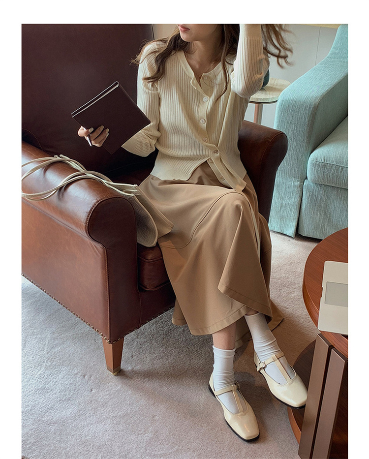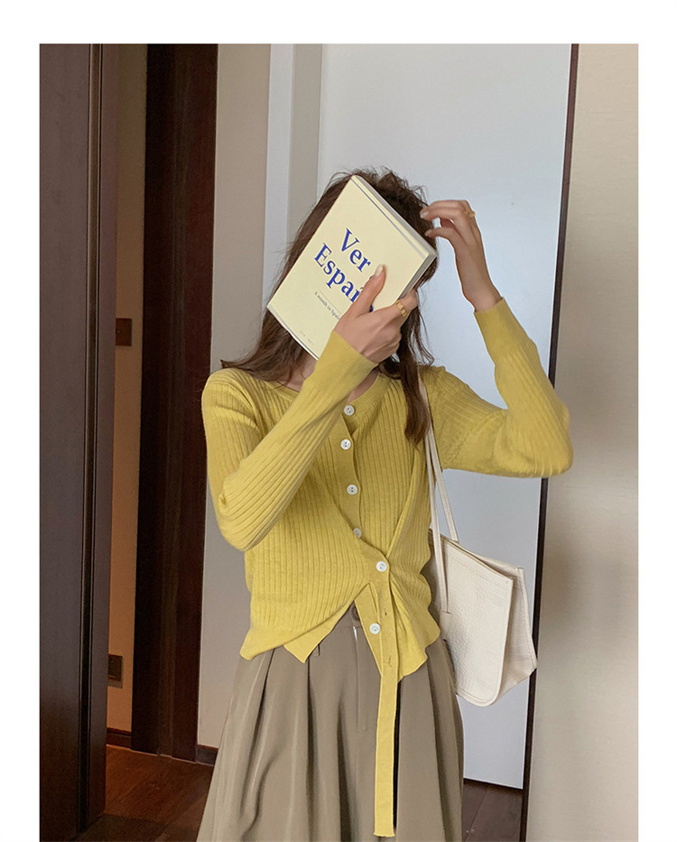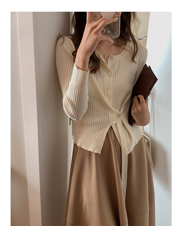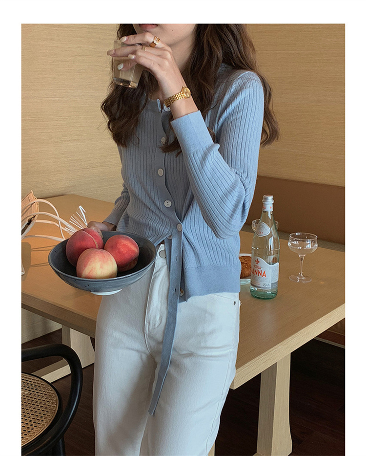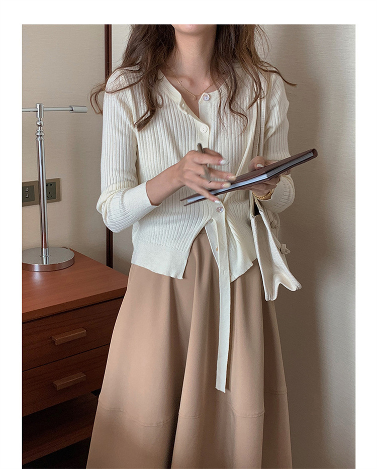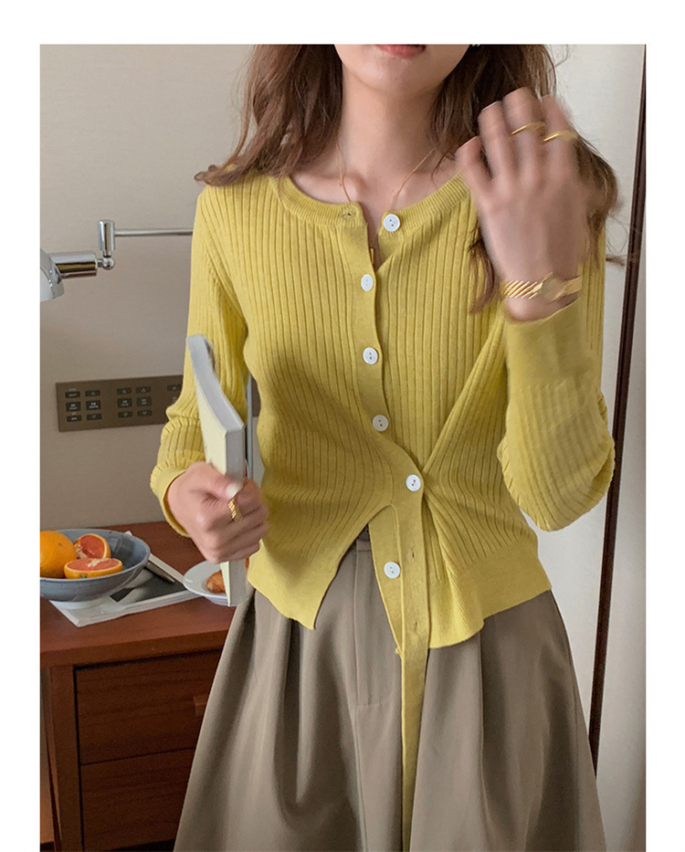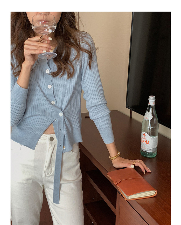 リブ編みの美しい質感とボタンフロントが大人の魅力を演出します。