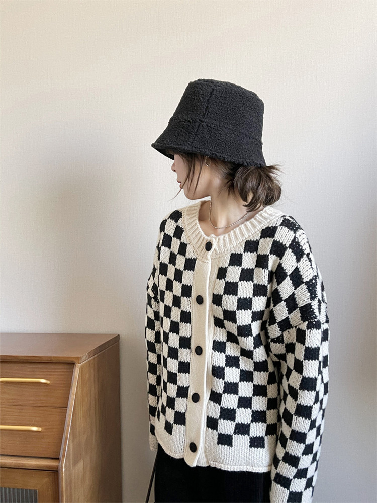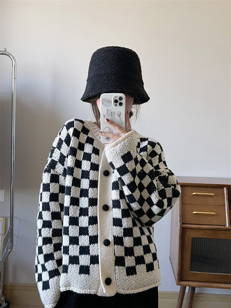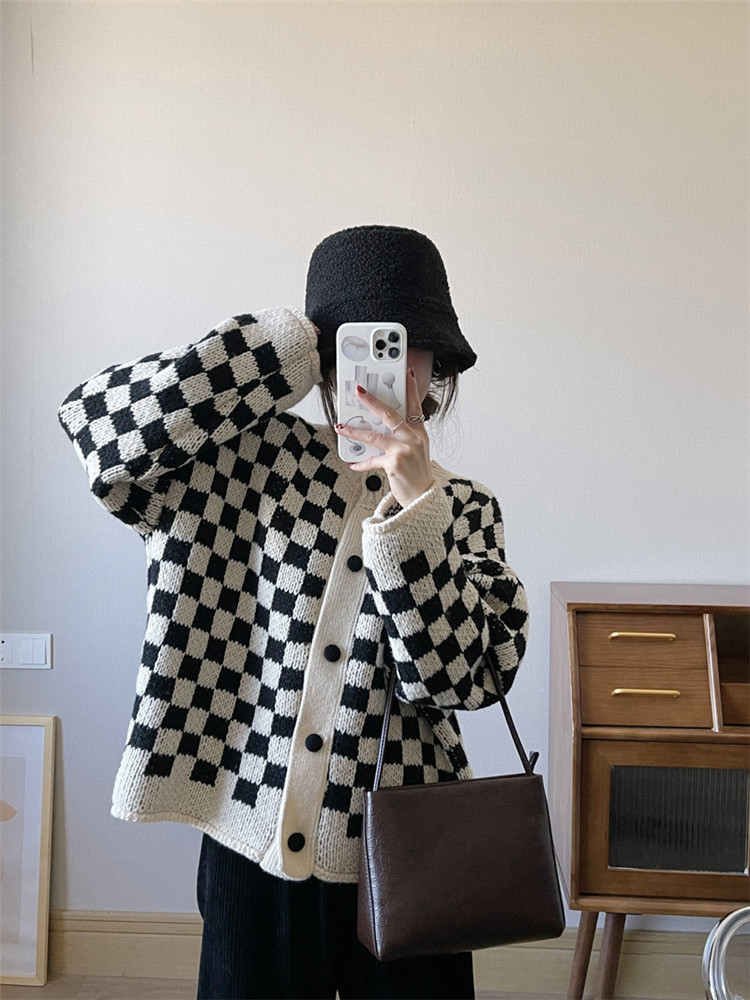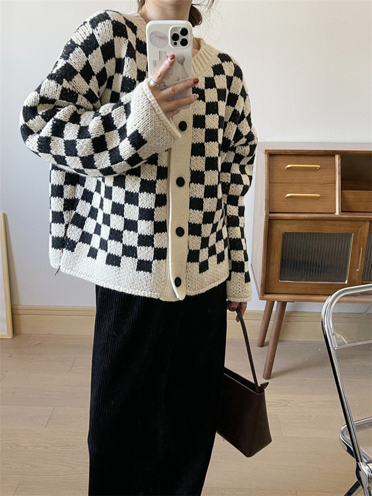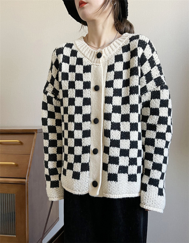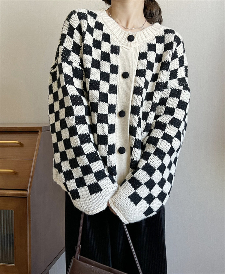 上品なチェック柄が魅力的なミドル丈レディースカーディガンです。
