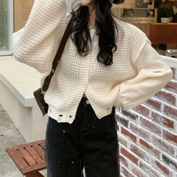 透かし編みデザインがおしゃれな印象を演出し、秋冬コーディネートにぴったり。