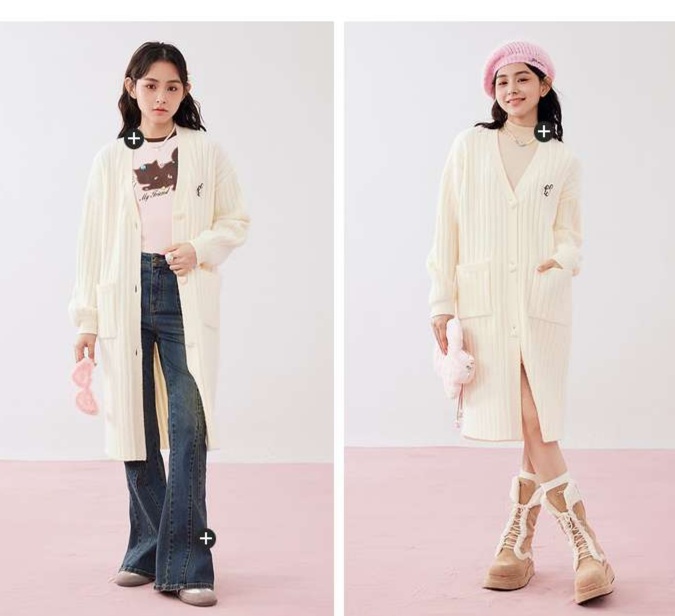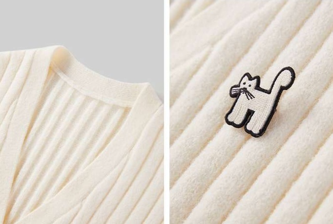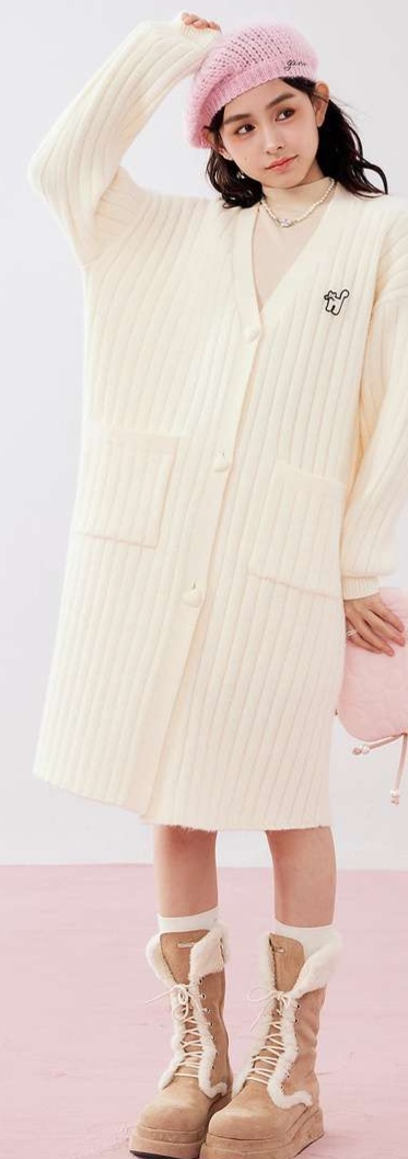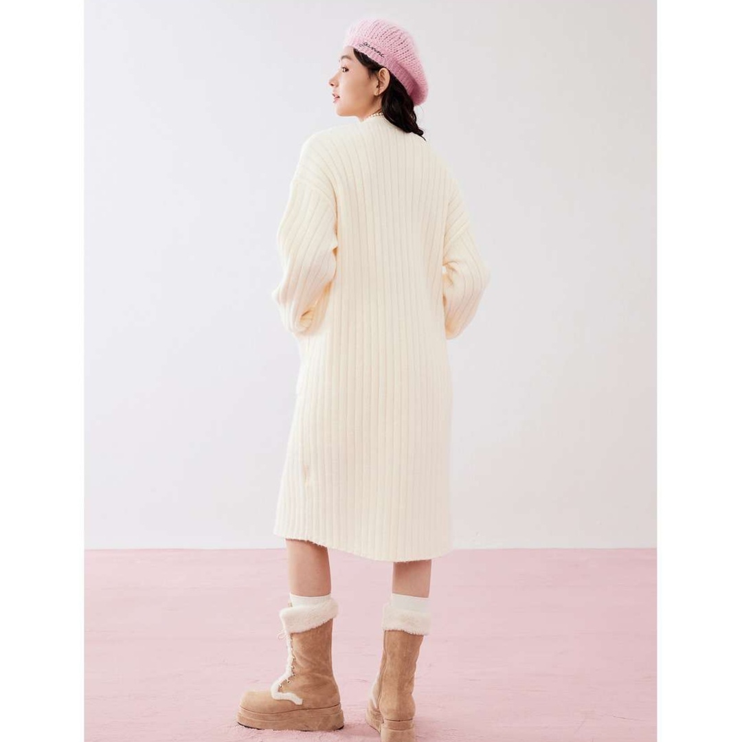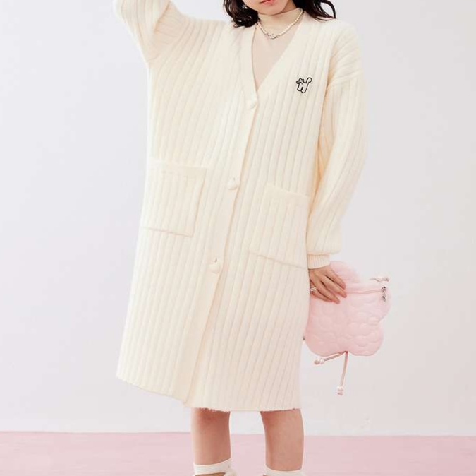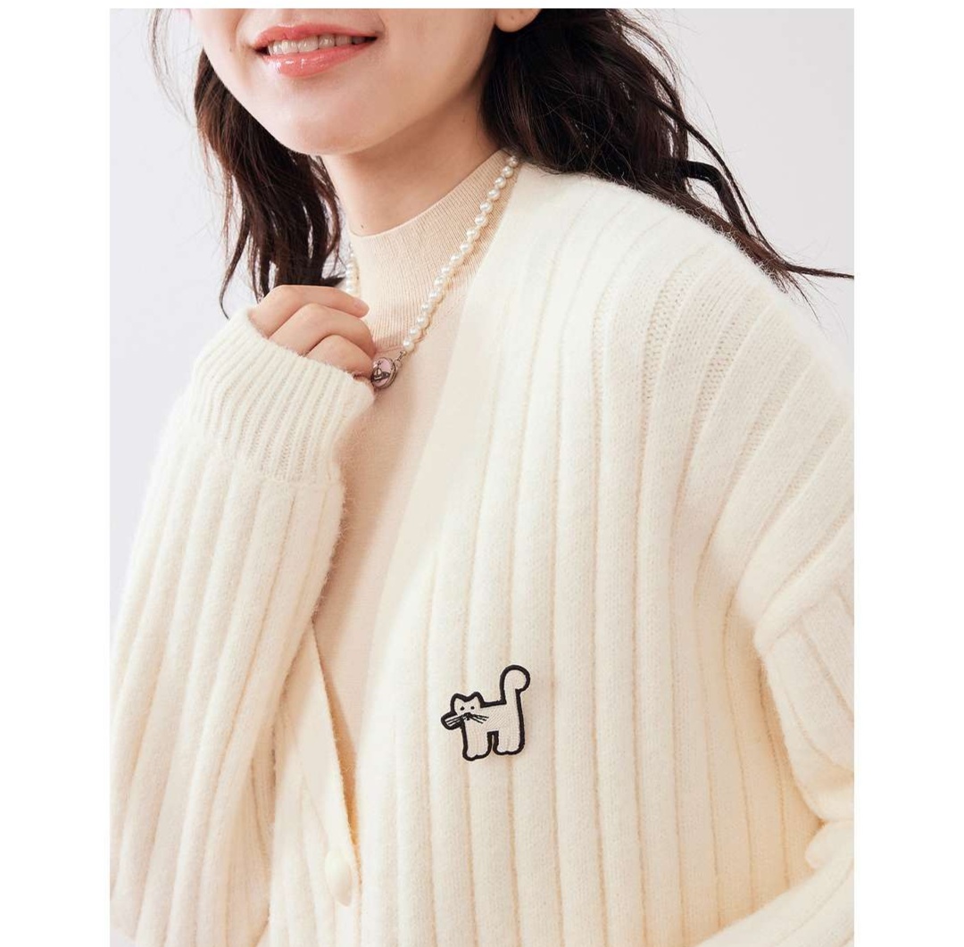 白のレディースカーディガン特集。リブ編みのロング丈カーディガンワンピースは、ゆったりとしたシルエットが魅力。フロントボタン仕様で、胸元には愛らしい小猫のブローチが付いており、取り外しも可能。暖かみのある素材感が心地よく、ベレー帽や長靴との組み合わせで、甘さを引き立てるコーディネートが楽しめる。どんなシーンにもぴったりな一着で、秋冬のスタイルを彩ります。