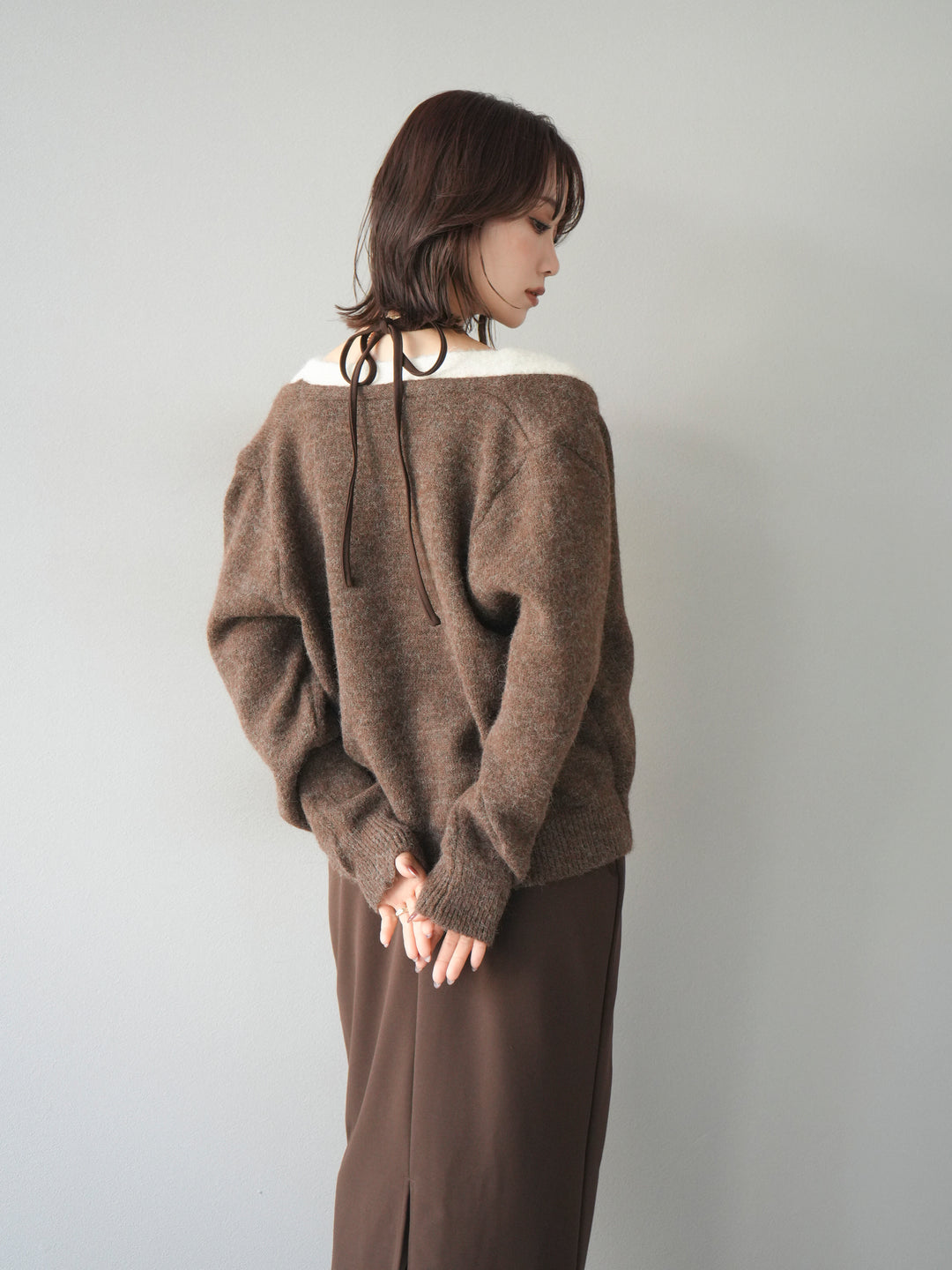 ブイネックデザインで首元をすっきり見せ、どんなスタイルにも合わせやすい万能アイテム。
