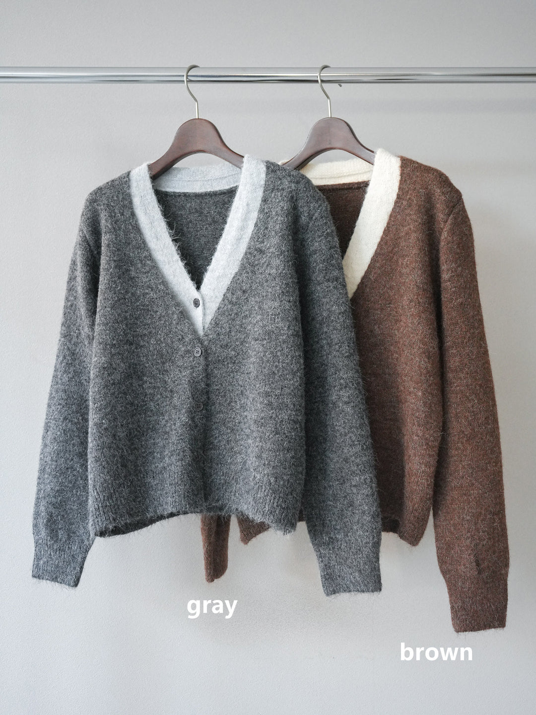 グレーとブラウンの二色から選べて、重ね着にも最適な着回し力抜群のニットカーディガンです。