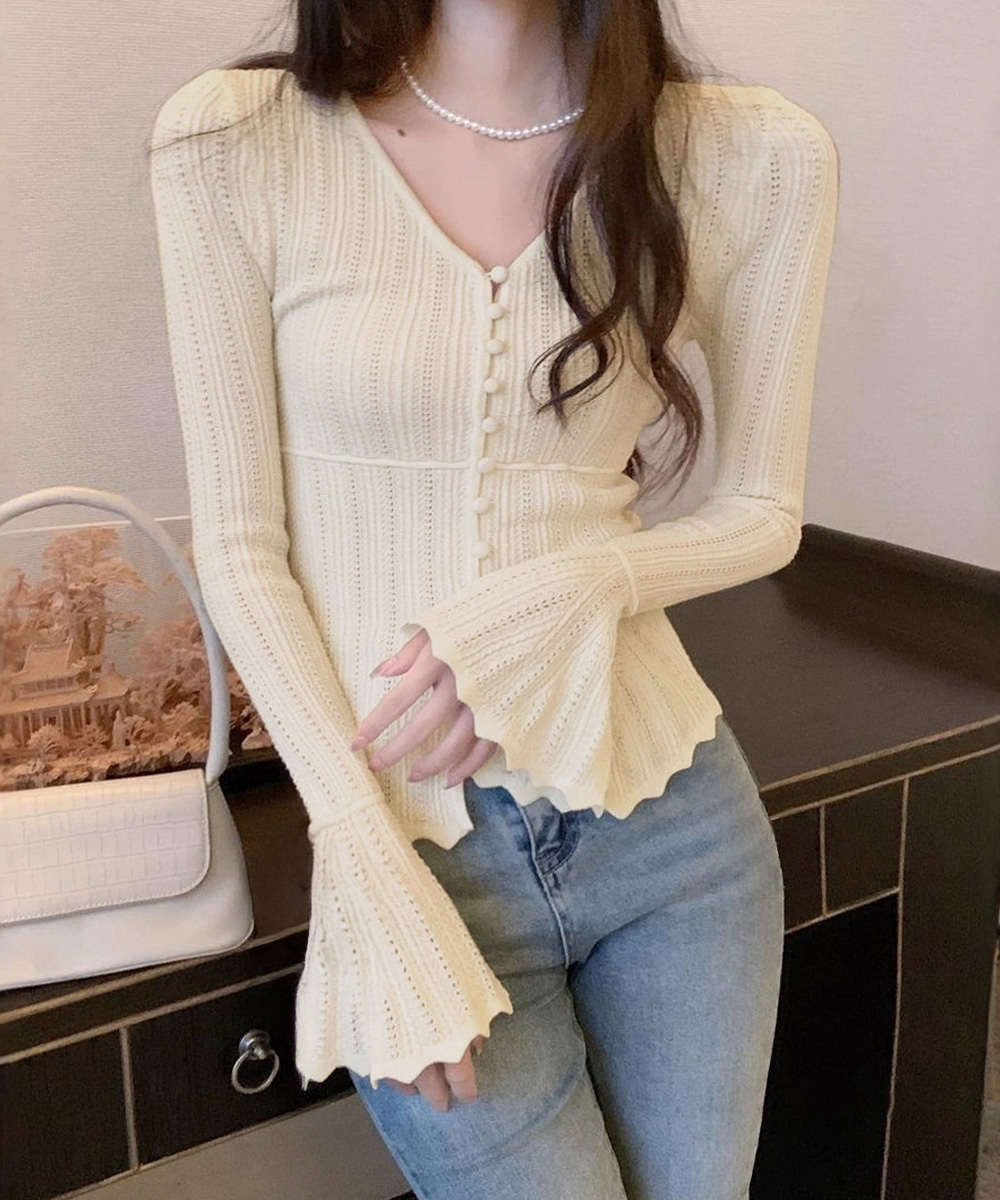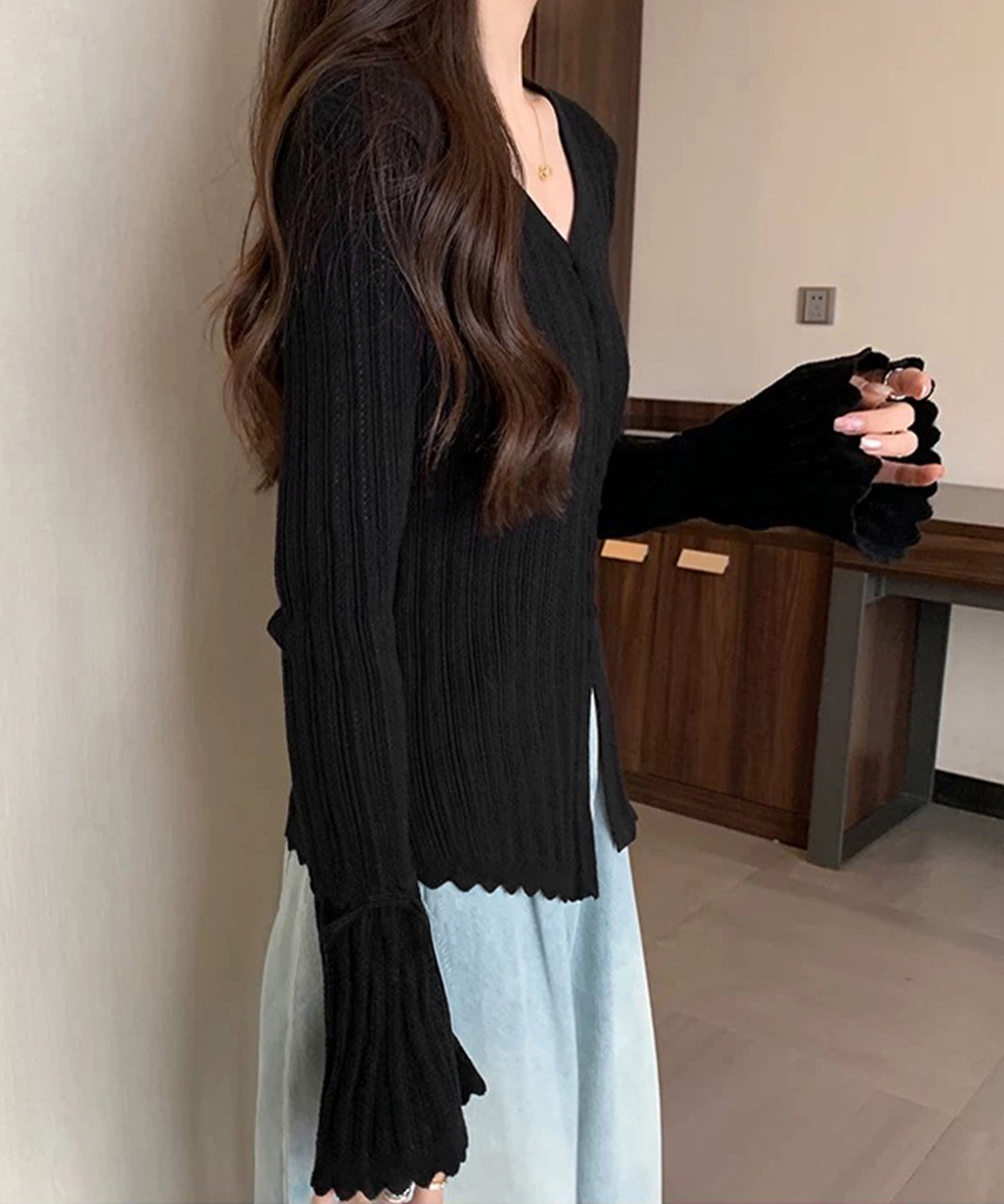 ほどよく広がるフレア袖と縦ラインの編地が女性らしい柔らかな印象を作ります。
