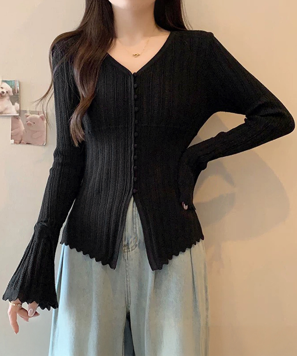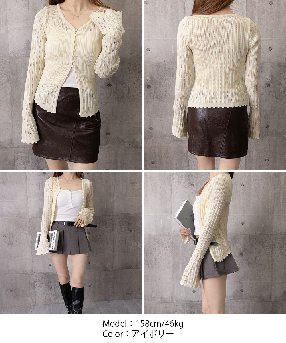韓国風前開きニットトップスレディース 薄手ニットカーディガンVネック フロントボタンニットソー 大人可愛いニットきれいめ スカラップ裾ニット キャンディスリーブ タイトニット着やせ 春先から秋口まで活躍する、レディース向けVネックニットカーディガン。 すっきりとしたシルエットで、全体をバランスよく見せる。 ほどよく広がるフレアスリーブと縦ラインの編地が、女性らしい柔らかな印象を演出。 デニムやスカート、きれいめパンツと合わせやすく、通勤やお出かけなど日常のさまざまなシーンになじむ一枚。 素材:レーヨン89%+ナイロン11% カラー:ブラック/アイボリー サイズ:ワンサイズ 前丈:約56cm 後ろ丈:約51cm 肩幅:約29cm 袖丈:約71cm ゆき:約85.5cm 身幅:約36cm 胸囲:約72-102cm 裏地:なし 伸縮性:あり 透け感:あり ※デザイン上透け感がございますので、インナーの着用をおすすめ致します。