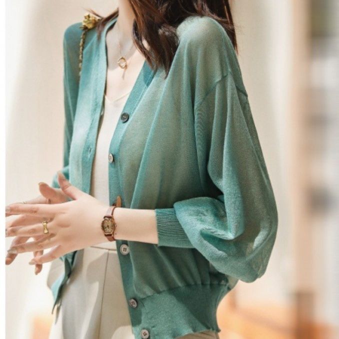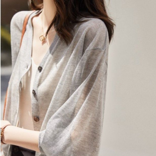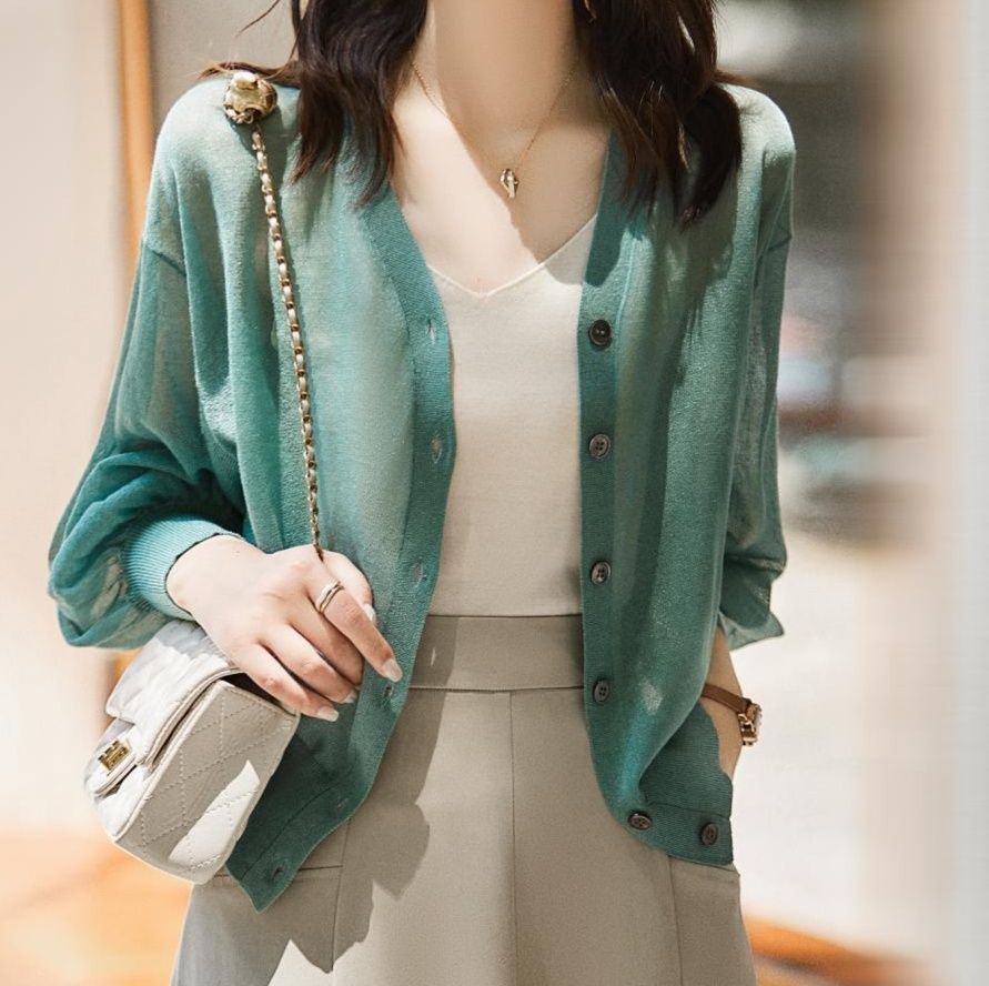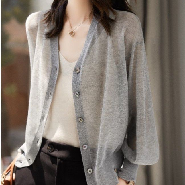 上品な深Vネックデザインが印象的なレディースカーディガンです。
