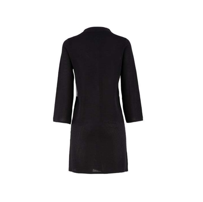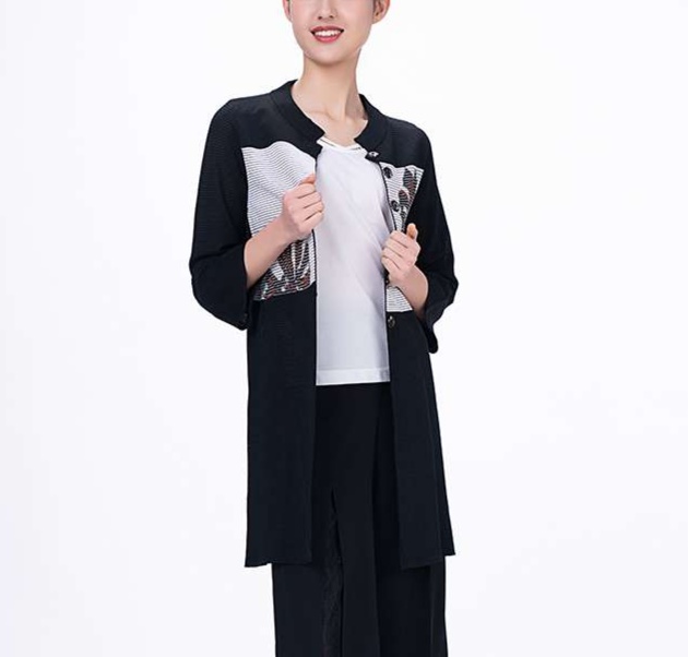 胸元に施されたストライプと花柄の切替えが印象的なレディースカーディガン。シックな黒のロング丈が上品さを演出し、シンプルなスタイルにもぴったり。オフィスシーンからカジュアルなお出かけまで幅広く活躍する一着で、七分袖デザインは季節の変わり目に重宝する。女性らしい花模様がアクセントとなり、様々なコーディネートに自然に溶け込むアイテムです。