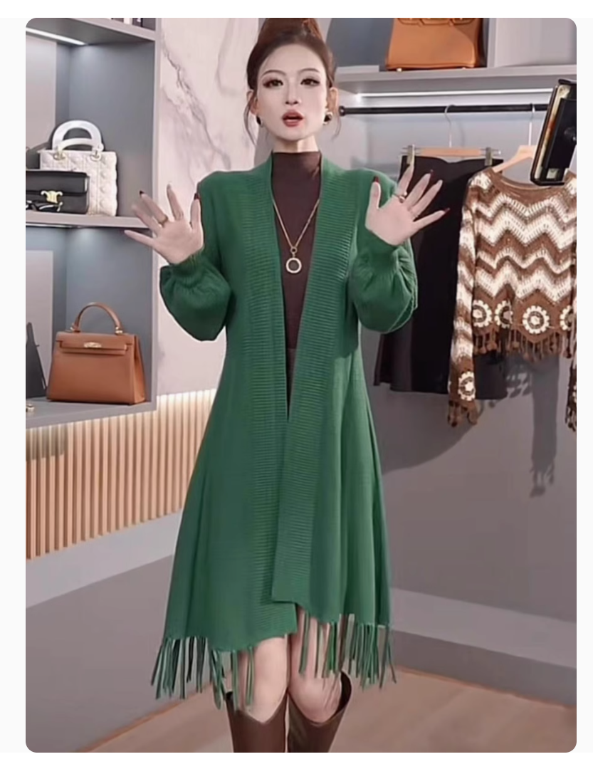 華奢なリブ編みと裾のフリンジが特徴のブラウンレディースカーディガン。ロング丈でゆったりとしたシルエットが体型をさりげなくカバーし、スタイリッシュな高め襟元が洗練された印象を与えます。長めの袖丈はこなれ感を演出し、ニットワンピースとしても活躍する万能アイテムです。秋冬のコーディネートにぴったりな一着で、さまざまなスタイルに合わせやすいデザインが魅力です。